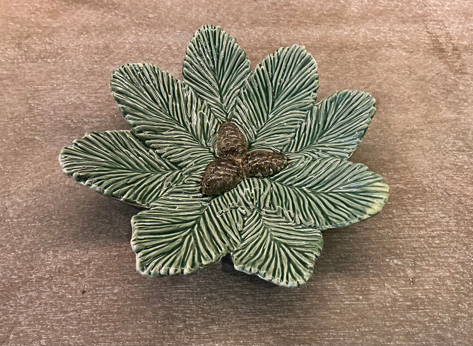 Pine tree themed bough plate with pinecones in the center of the dish.