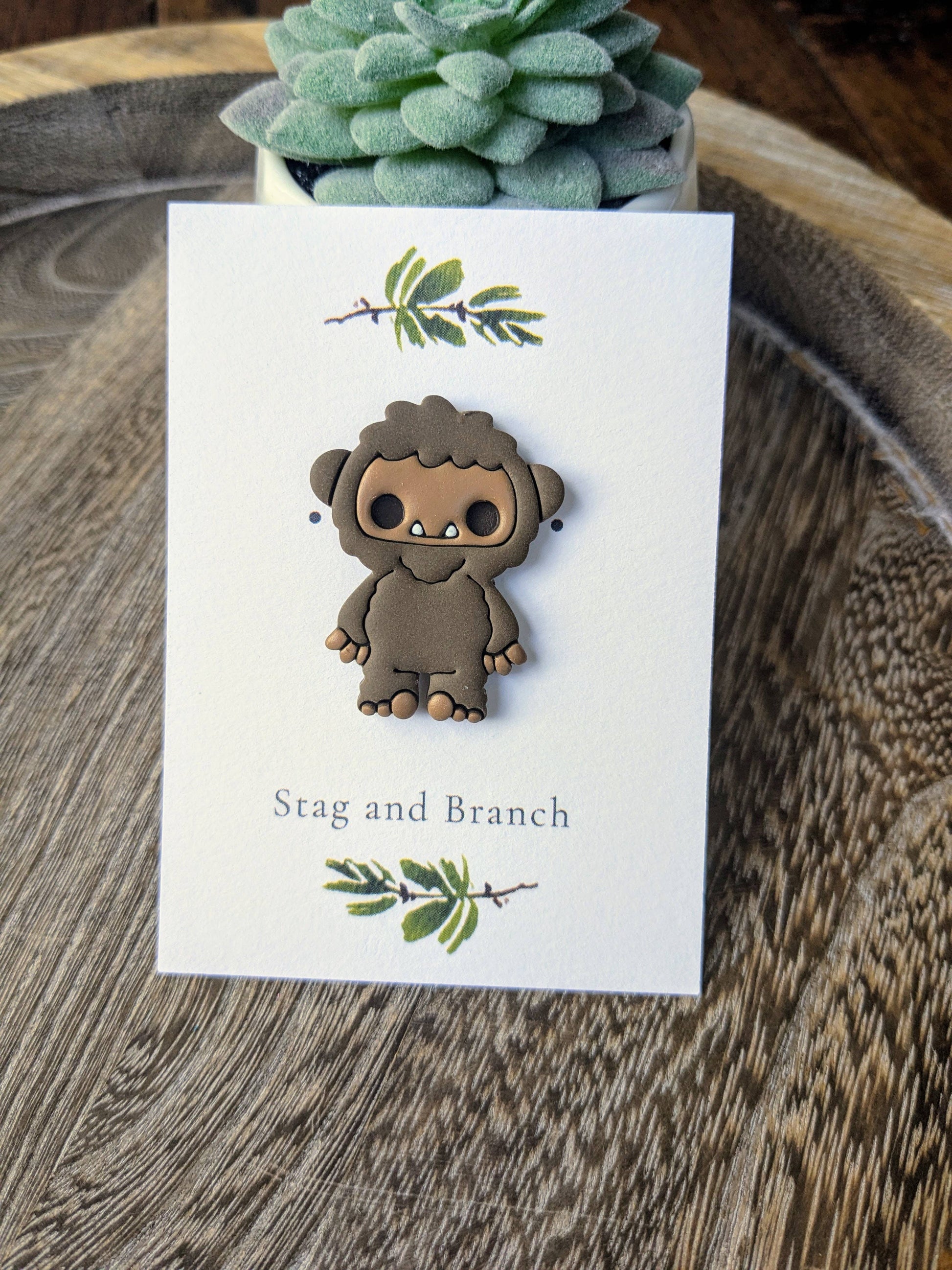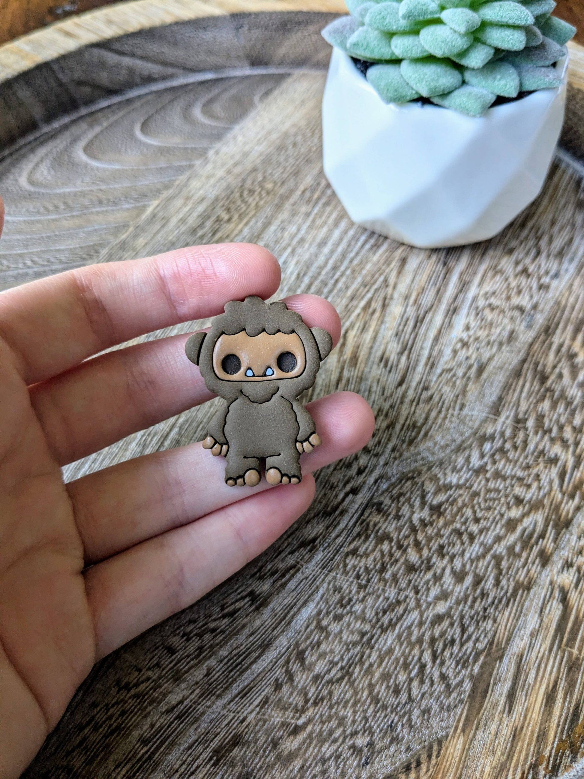 Cute little hand-painted cryptid Bigfoot polymer clay pin. Handmade in the Pacific Northwest. Made with: metal pin and backing, acrylic paint, polymer clay.