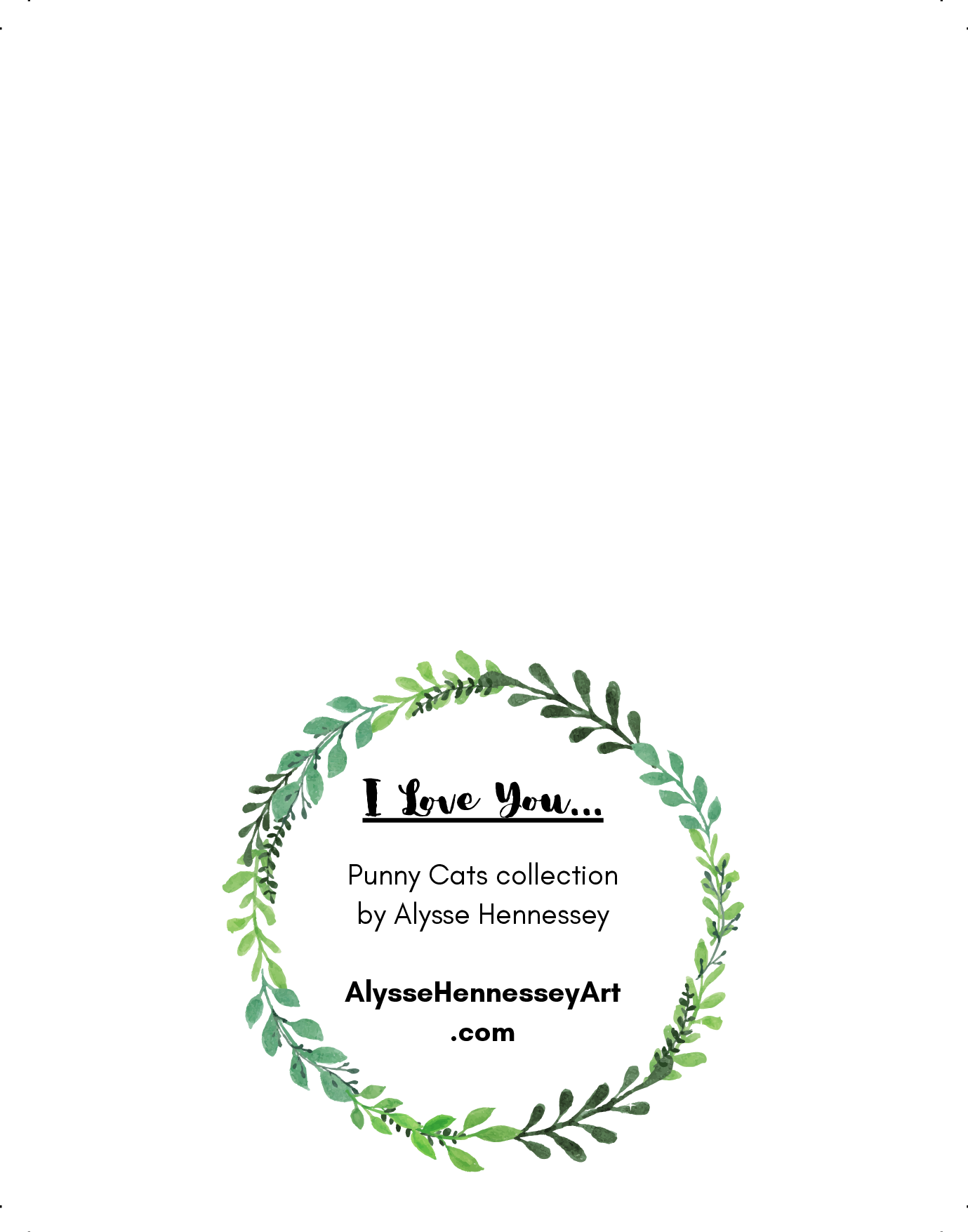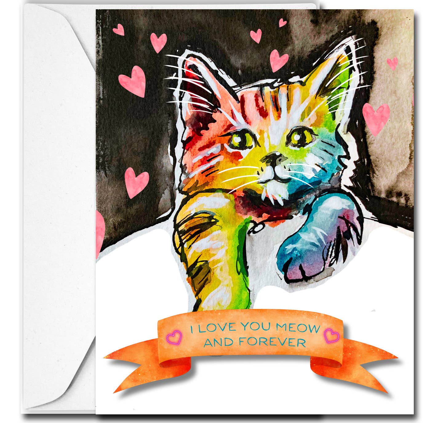 Glossy, bright greeting cards, , based on hand painted original art. "I Love You Meow and Forever" is part of the Punny Cats collection, as well as a love theme for valentines day or anniversary. 4.5"x5" card with envelope and clear slip cover. Blank inside.