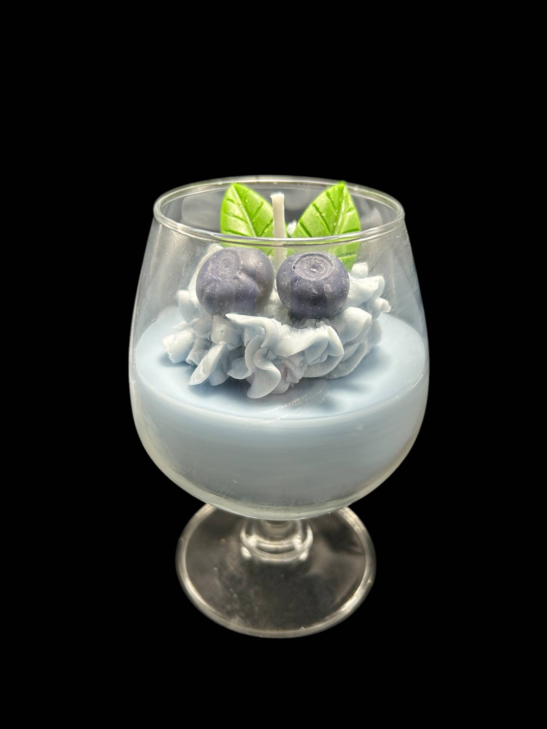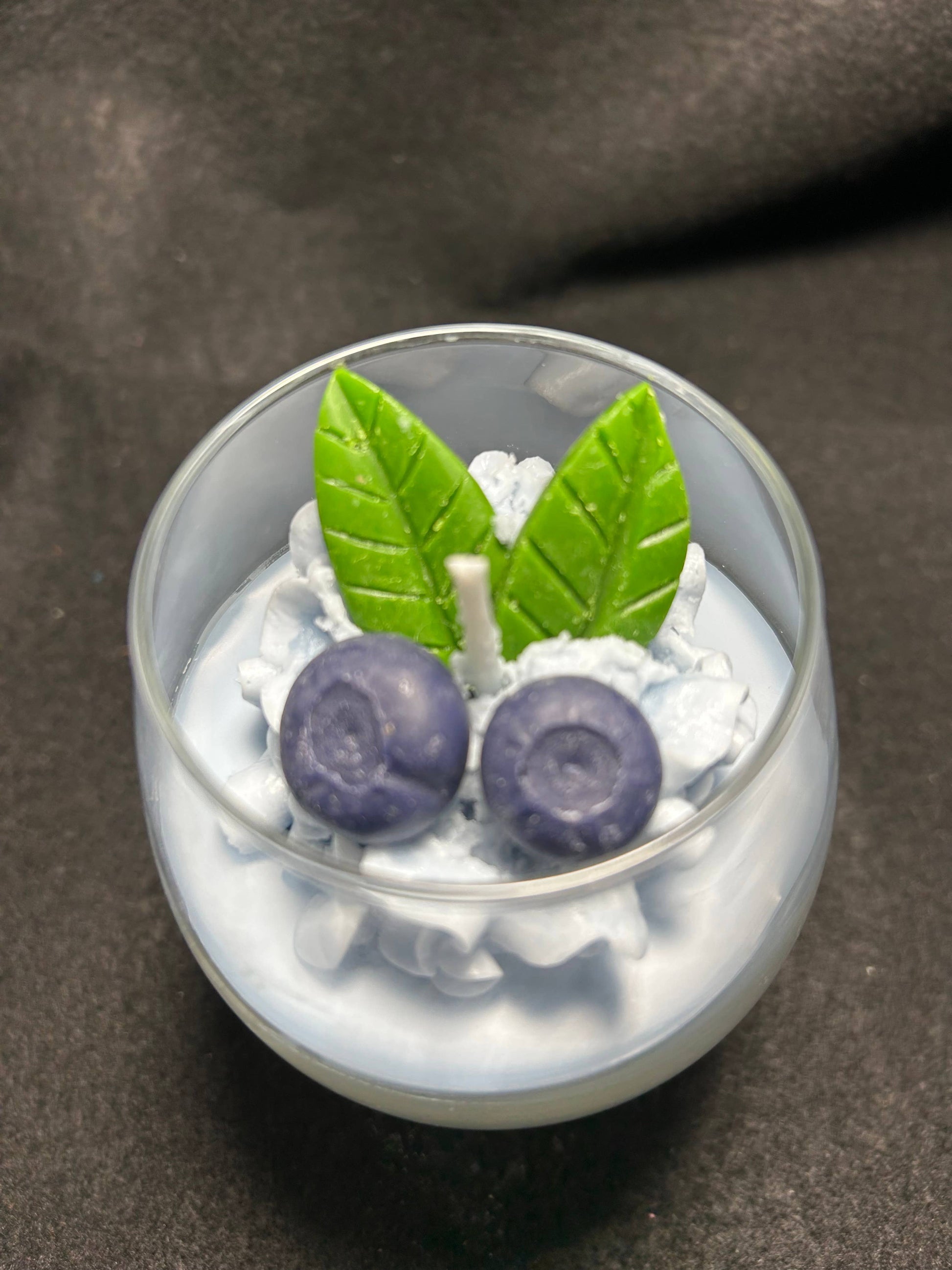 12oz Blueberry Cobbler Cognac Candle. Parasoy wax scented with Blueberry Cobbler. 30-40 hour burn time. Topped with blueberries, leaves and whipped cream. Decor candle or burn the embeds into wax puddles.