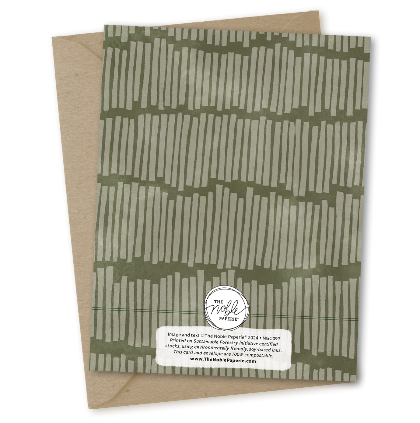 Features: Whimsical cat and Christmas tree illustration front, green slat patterned back • Blank inside • A2 size (4.25" x 5.5") • Offset printed in Southern California on Sustainable Forestry Initiative (SFI) certified, heavyweight 14 point, uncoated stock, using environmentally friendly soy-based inks • Comes with a matching kraft paper, recycled envelope and fully recyclable plastic sleeve • Both greeting card and envelope are completely compostable