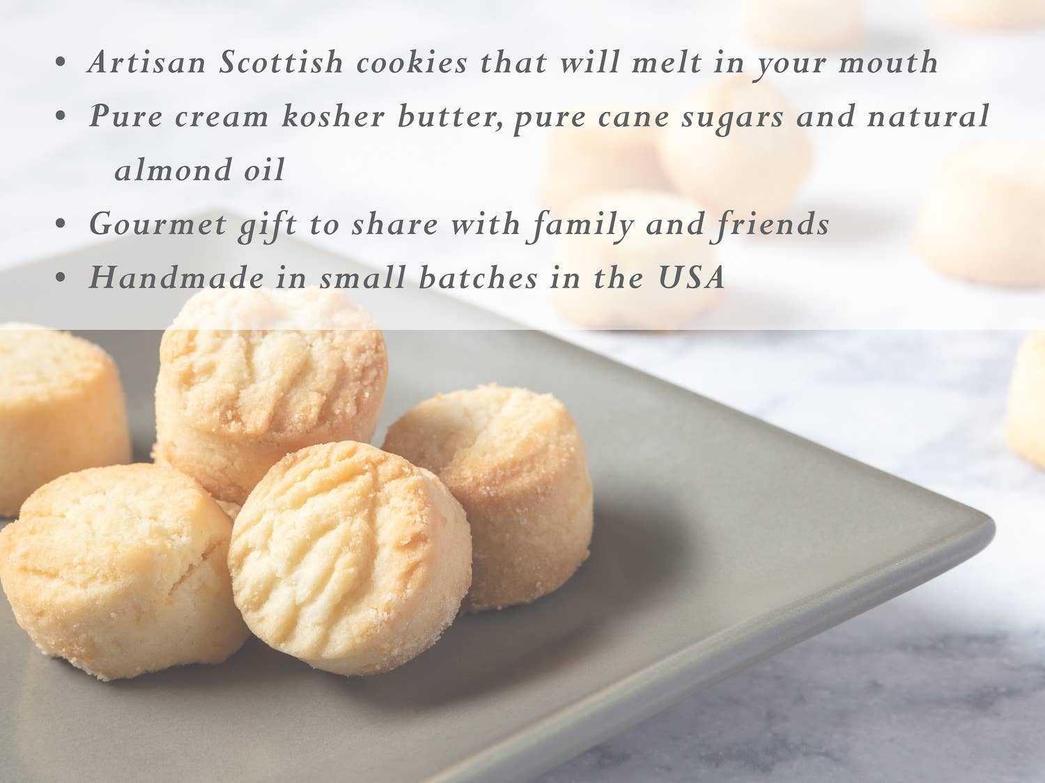 These indulgent shortbread cookies handmade following several time-honored recipes that the baker perfected into her own gourmet expression. The traditional butter cookies are homemade using the finest quality ingredients and small batch baking expertise, which has elevated Scottish shortbread cookies to an artisans’ level. These delectable shortbread morsels are made fresh and simple, with kosher dairy products. It begins with pure cream butter, enriched wheat flours, pure cane sugars, corn starch and natural almond oils.