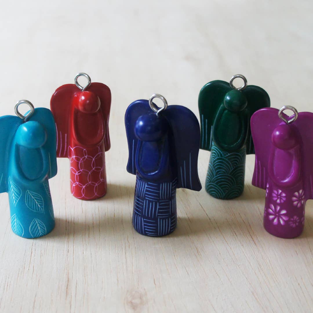 These colorful ornaments are a fair trade product handmade in Kenya. They are hand carved out of stone, sanded until smooth, and dyed. Then an artisan uses a knife to etch the patterns into each ornament.