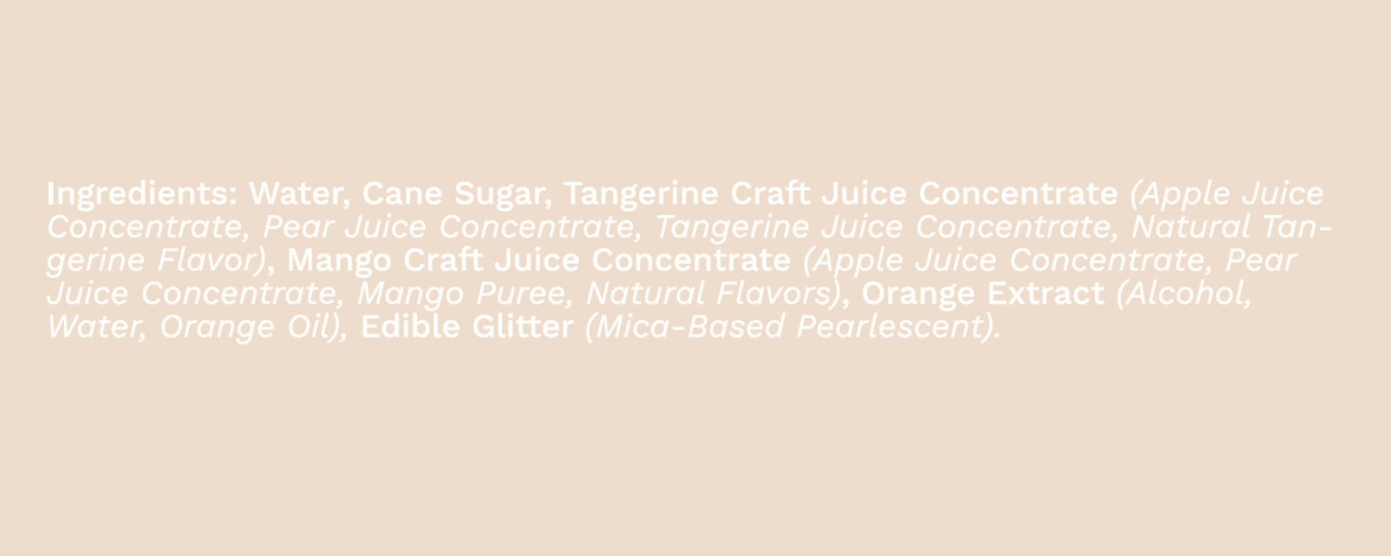 Get your sparkle on with this concentrated, glitter-infused Glitter Mimosa Mixer. It contains tangerine and mango in addition to FDA-approved edible glitter that is made from the mineral mica. There's absolutely zero micro-plastics or anything artificial. Just add 1/2 to 1 ounce of this mixer to a glass of sparkling wine or sparkling juice for a mimosa or "mock-mosa". Or add 1 ounce of this mixer to 1-2 ounces of white rum and a splash of seltzer on top for a fun, tropical cocktail. Each 16 fl oz glass bottle makes 16-32 drinks!