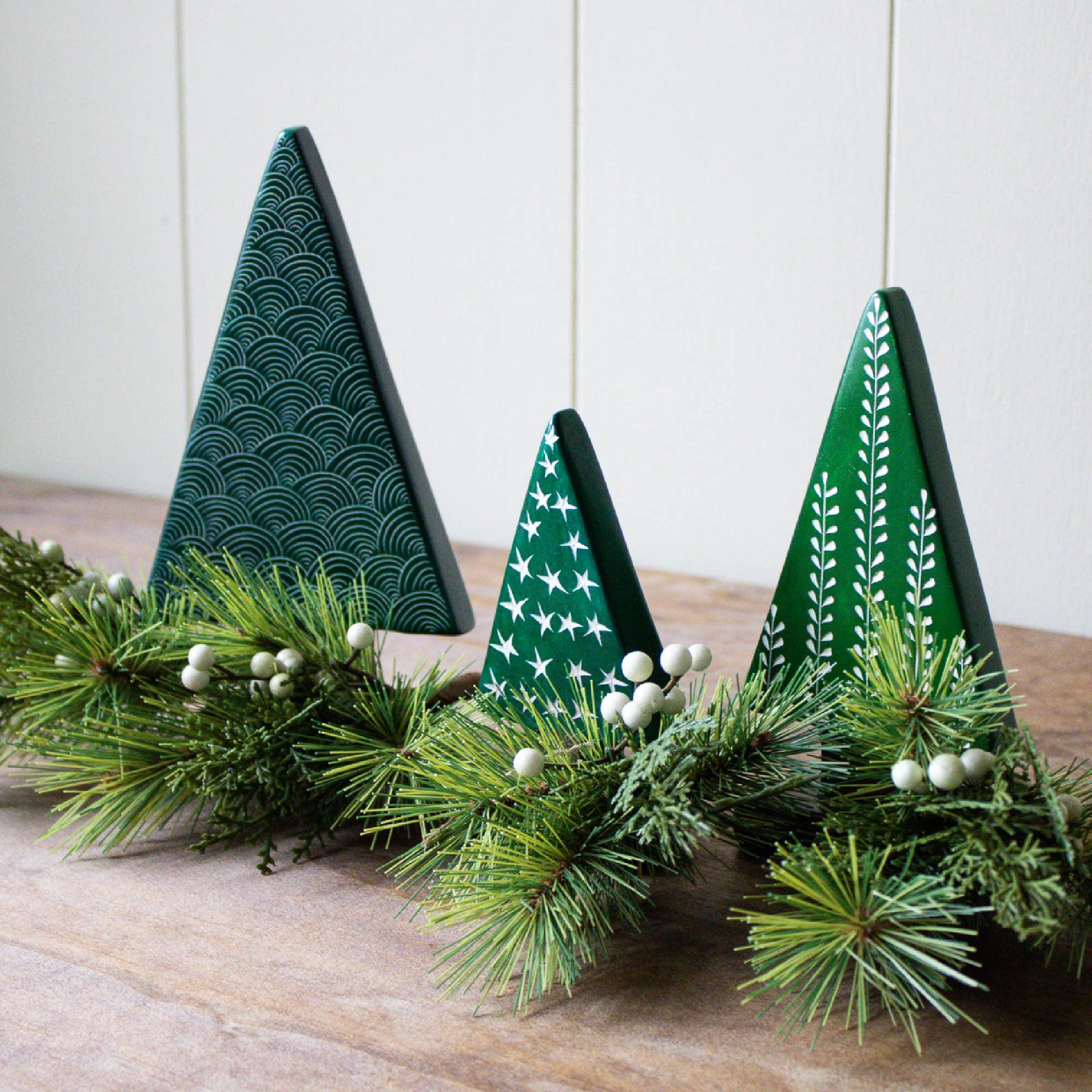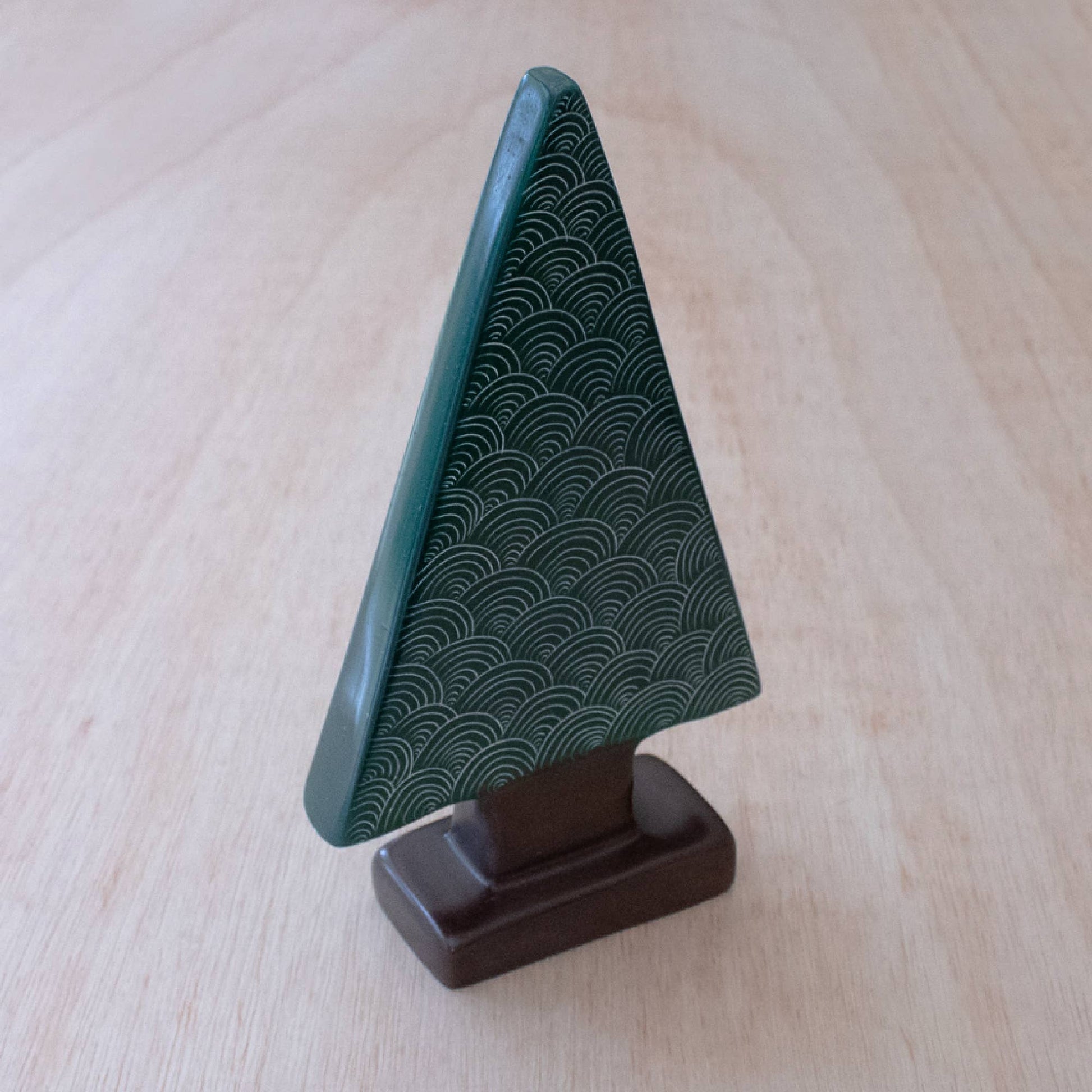 These green Christmas trees are a fair trade product handmade in Kenya. They are hand carved out of stone, sanded, dyed, and then etched, all using simple hand tools.