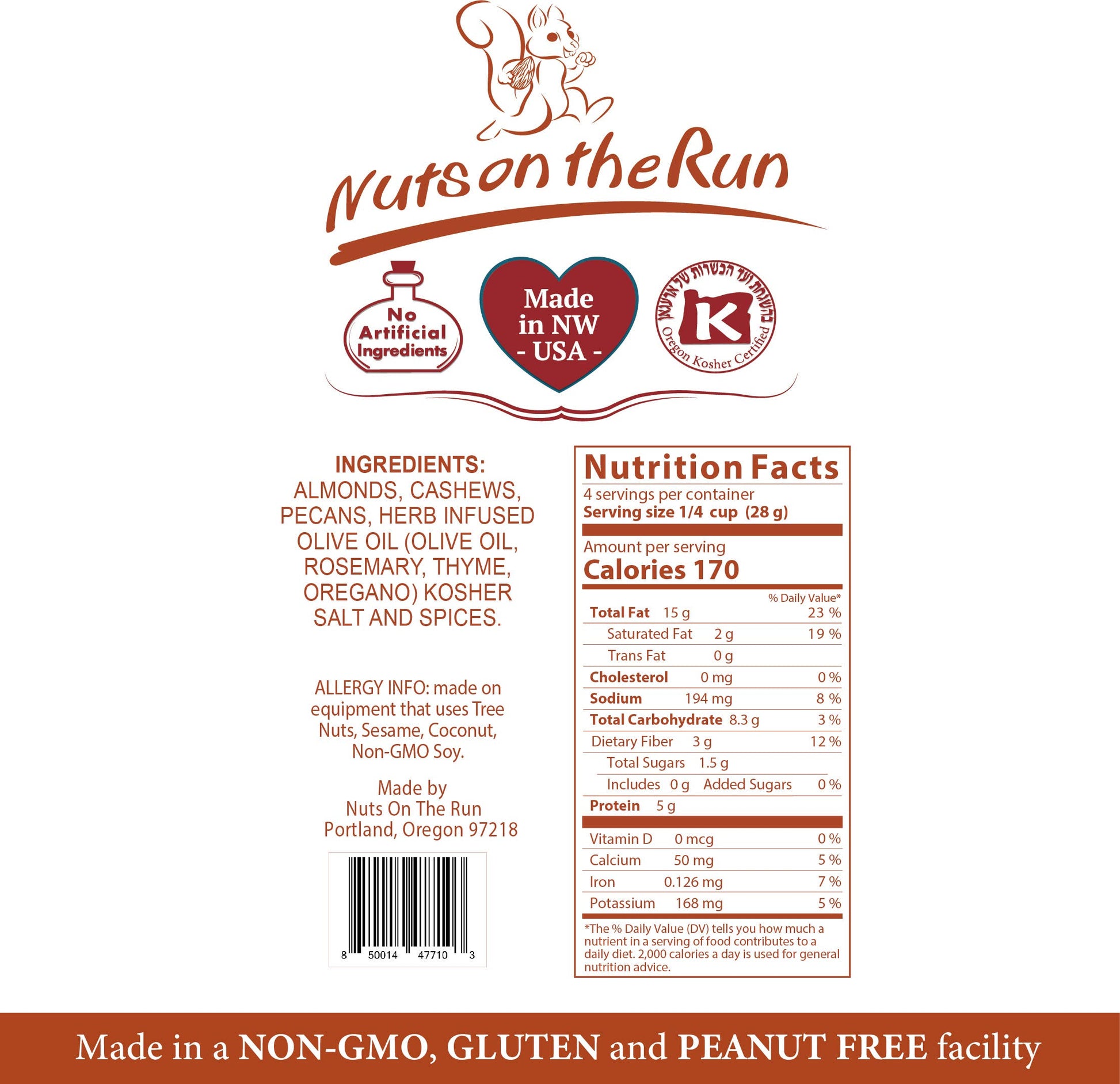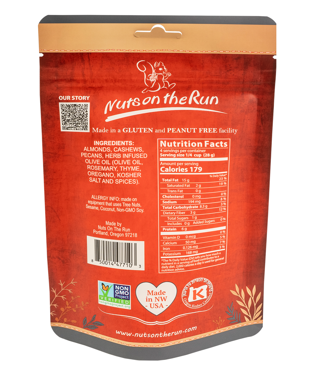 Italian Herb Nuts are gently roasted with a flavorful blend of Italian herbs, almonds, cashews, and pecans. They're toasted with a touch of extra virgin olive oil resulting in a tasty snack that you can enjoy and share with loved ones. Size: 4oz. This combination of Italian herbs, cashews, almonds, and pecans are oven roasted on low heat in small batches with a touch of extra virgin olive oil to ensure freshness! Crafted with the highest standards, 100% all natural, Kosher certified, non-GMO, gluten free, vegan, and peanut free. Whether you're enjoying time off or working through a busy day, our Italian Herb nuts are sure to provide you with a tasty boost of energy!