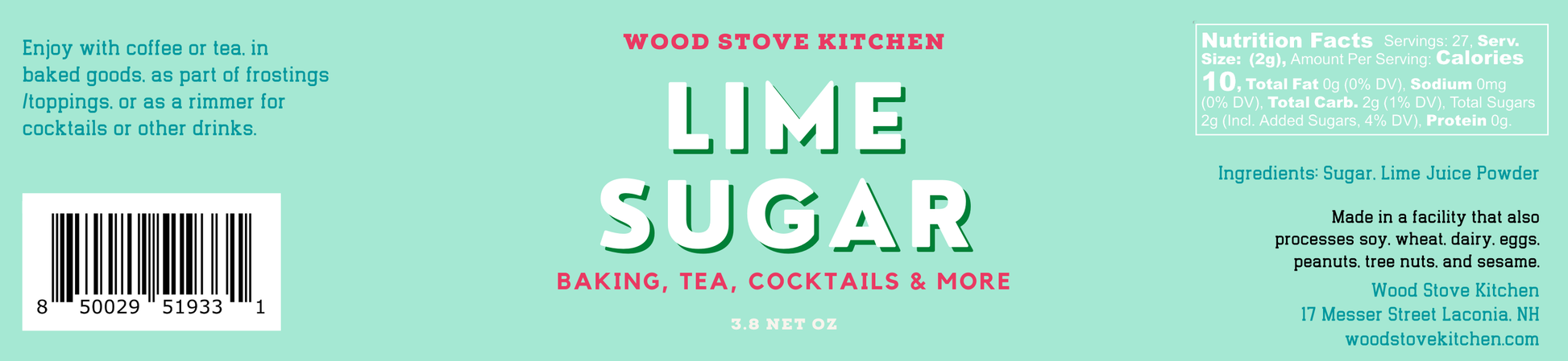 Made with powdered lime juice and pure cane sugar. Put in cocktails like mojitos, margaritas, or gimlets - or add to hot or iced tea. It is also a great additional to citrus-flavored baked goods. This product is in a clear, 4oz glass jar with white metal cap.