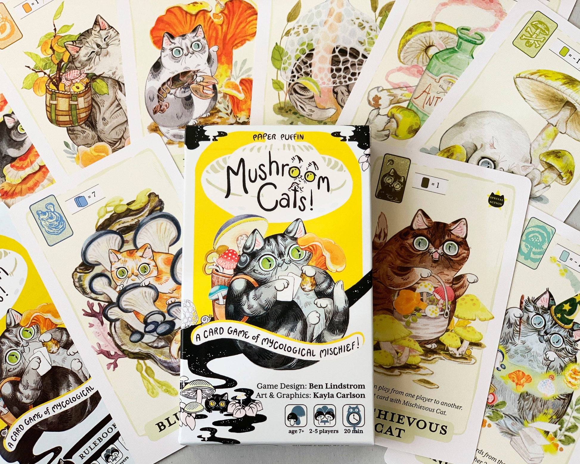 Mushroom Cats! was designed by Ben Lindstrom, and all the art and design for Mushroom Cats! was illustrated by PNW artist Kayla Carlson/PaperPuffin and published by Paper Puffin. Each copy of the game includes 52 cards and play instructions in a shrink-wrapped easy-open tuck box. Full-color tarot sized cards (2.75" x 4.75") printed on a smooth linen cardstock. 3rd Printing.