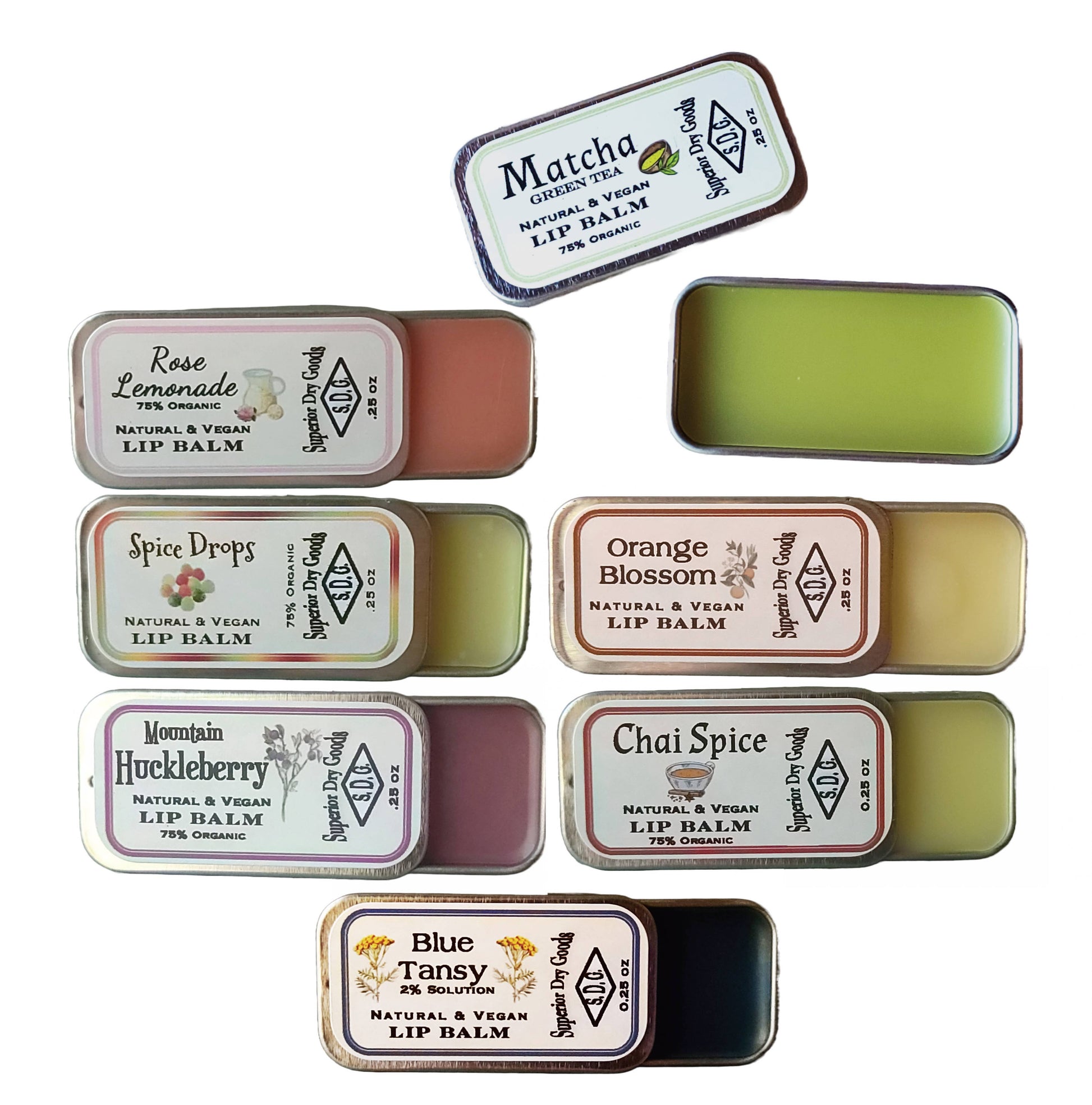 Handcrafted 0.3 ounce aluminum slider tins containing ultra-premium botanical lip balms. Tins measure 2" x 1" x 0.4" (L x W x H). Ultra-moisturizing and long lasting. Handcrafted in Eugene, Oregon.