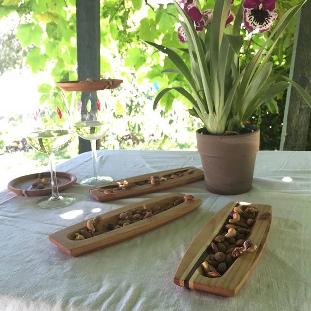 This boat allows you a fun way to serve nuts, olives, cherry tomatoes or chocolates. Made from Solid Red Alder.