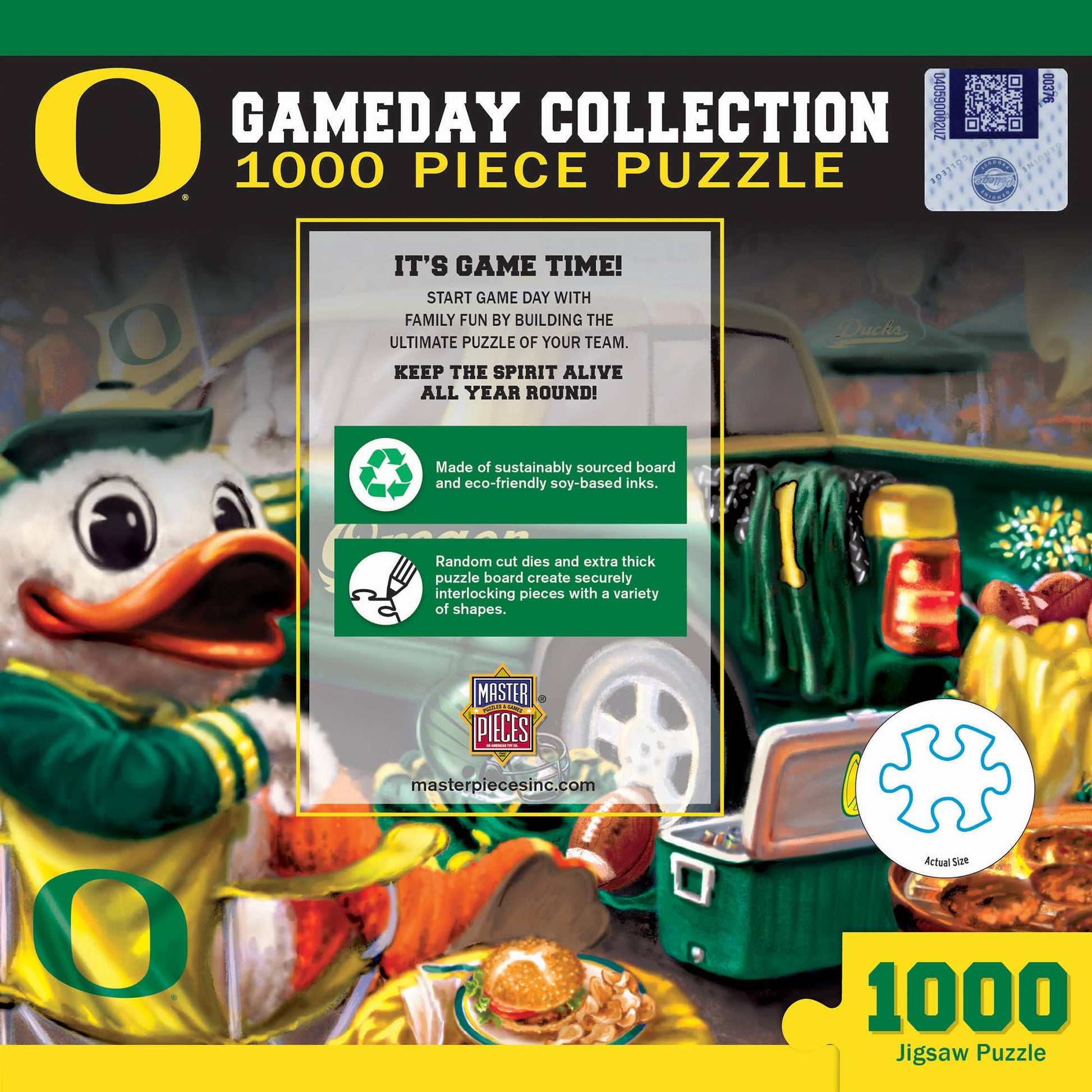 This MasterPieces NCAA 1000pc 19.25" x 26.75" Gameday Puzzle is perfect for any Oregon fanatic. Now fans can play all year long! To reduce its impact on our environment, the chipboard used in this puzzle is made of 100% recycled material.