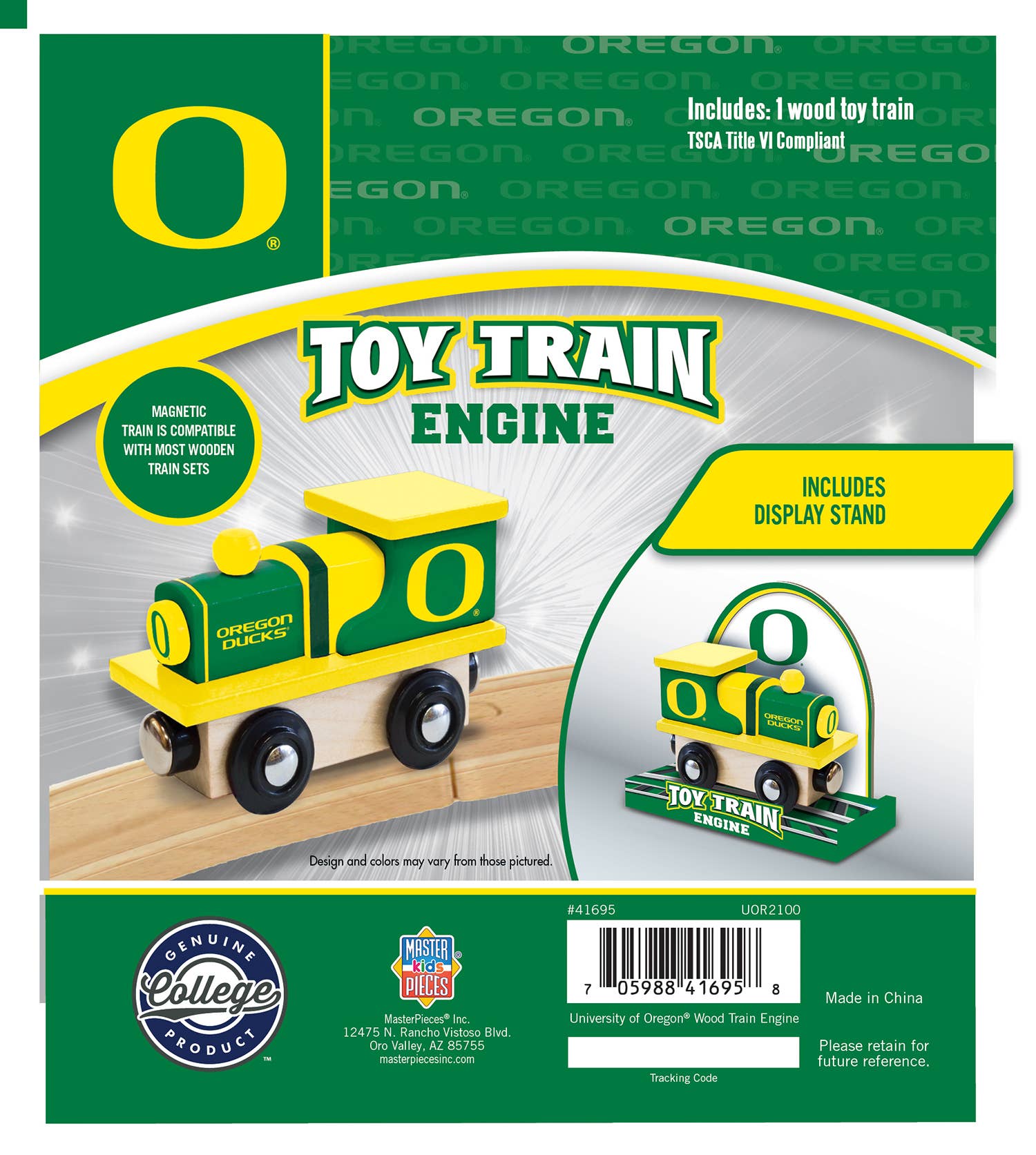 This officially licensed MasterPieces NCAA Oregon Ducks Team Train Engine is a must-have for all kids and sports fans! The wooden toy train is compatible with most 1" wooden train tracks and comes in your favorite college team's colors and logo.