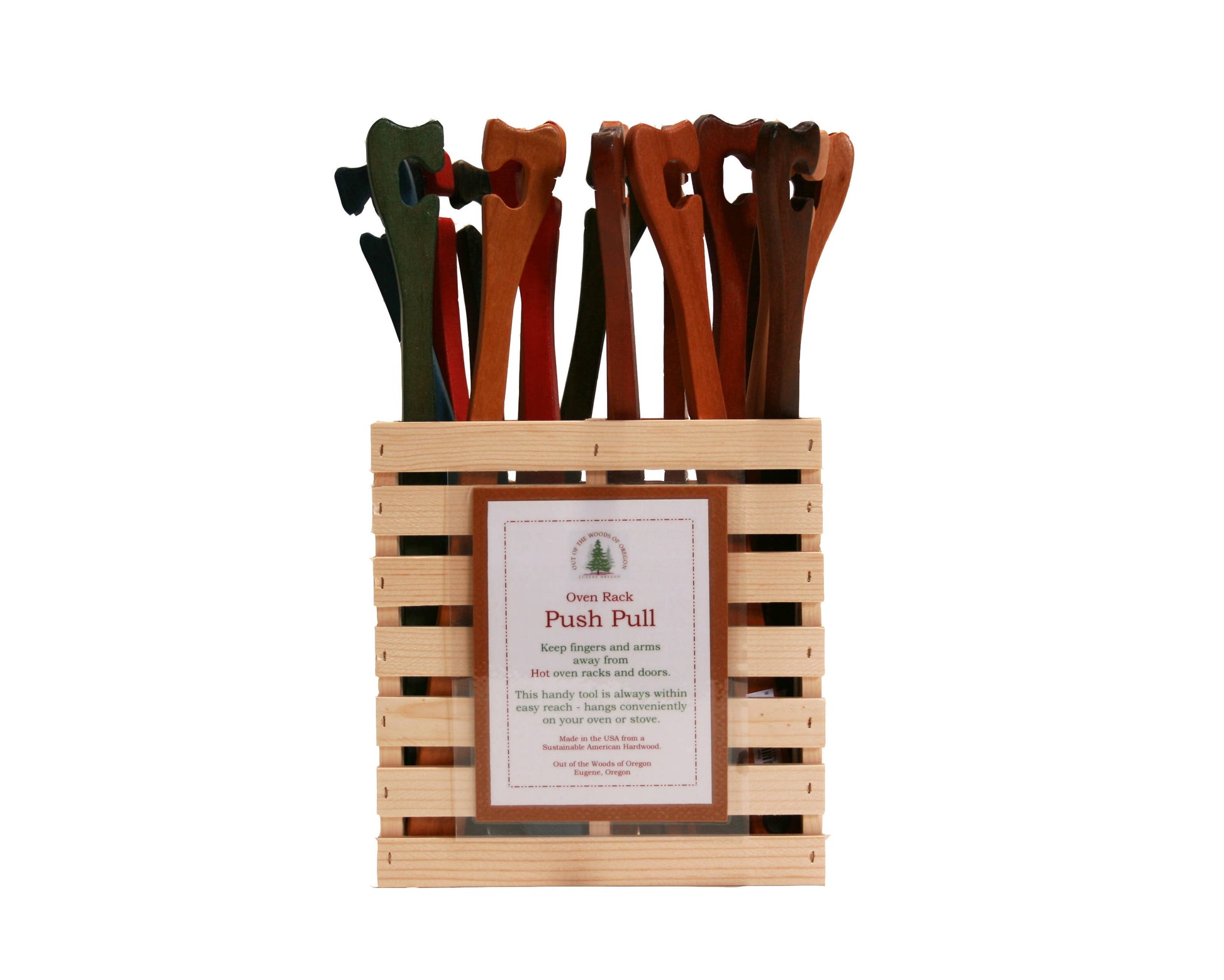 Oven rack push-pulls - 24 Assorted. Keep your arms and fingers safe from hot oven surfaces and racks. Use the hook to pull our hot oven racks and use the curved end to push the rack back into the oven. Each Push-Pull has a magnet on the end. Hang it on any metal surface to keep it always within easy reach. 24 Assorted of all 10 colors. Pine Display Crate included. Made in Oregon from Red Alder a sustainable American Hardwood. Size: 11.5" x 1.125" x .375" Hand wash and dry immediately.