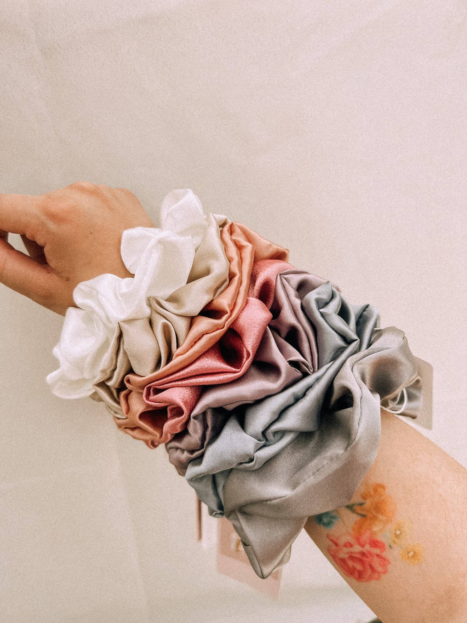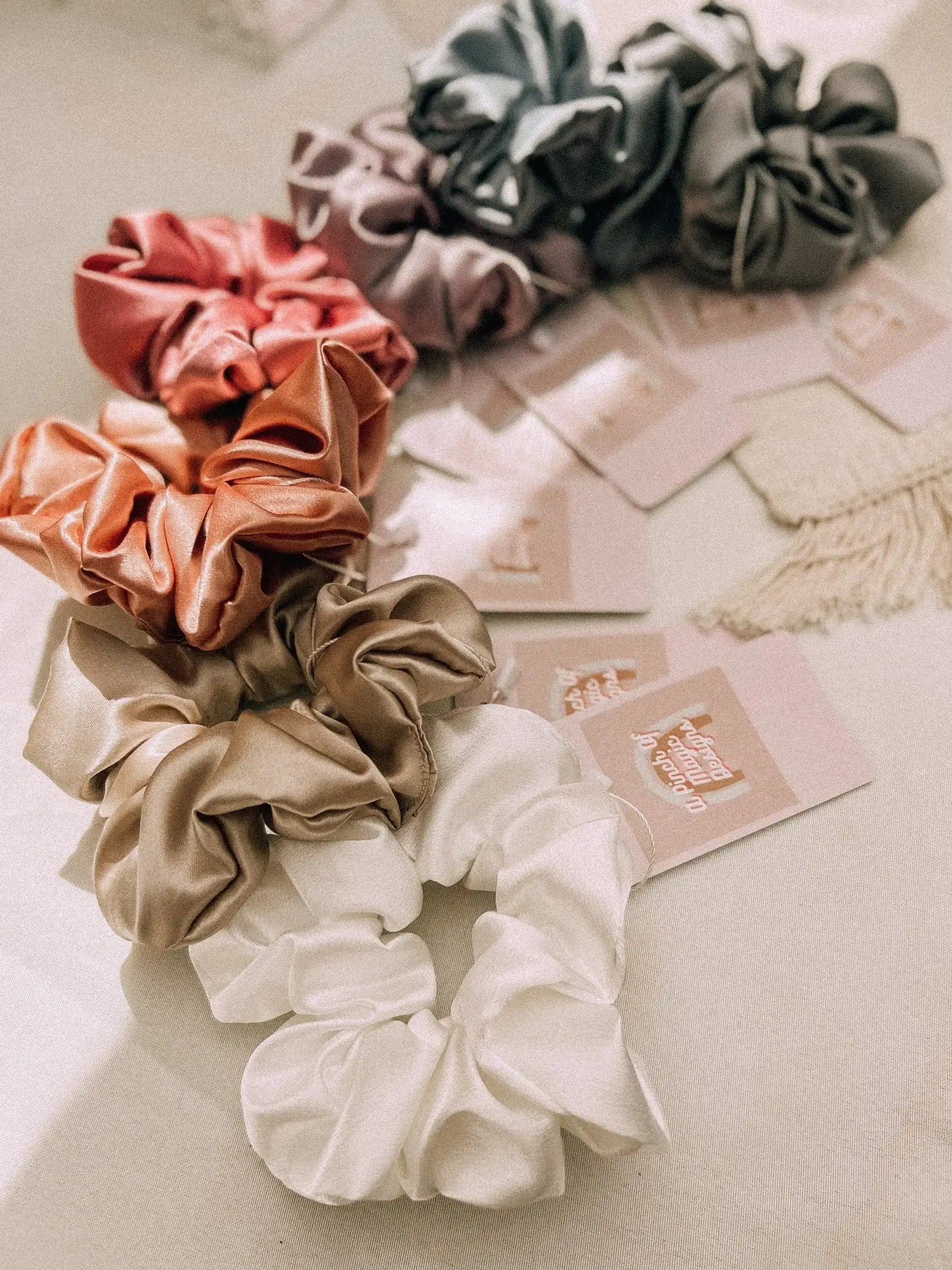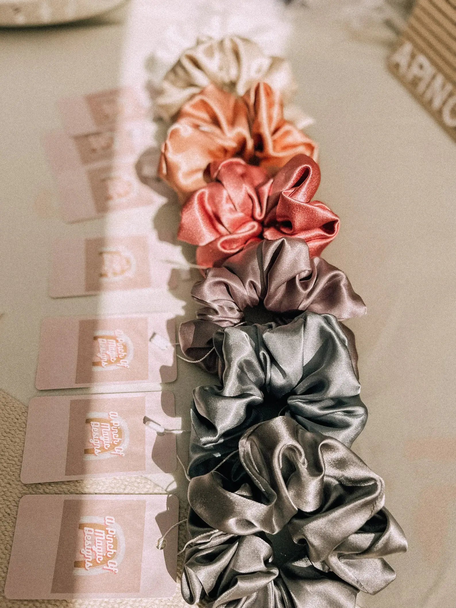 Satin hair scrunchie made with high quality satin fabric and elastic to ensure flexibility and stretch. Perfect for top knots, messy buns, workouts or on the wrist as an accessory. Reusable/Washable