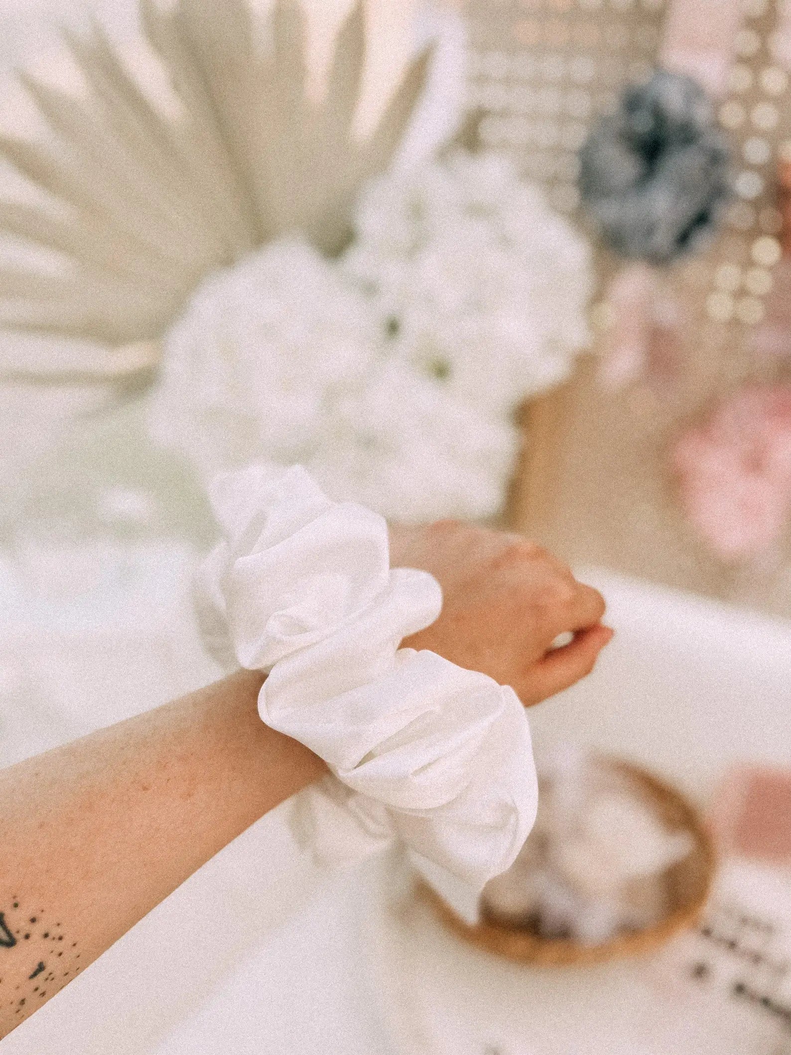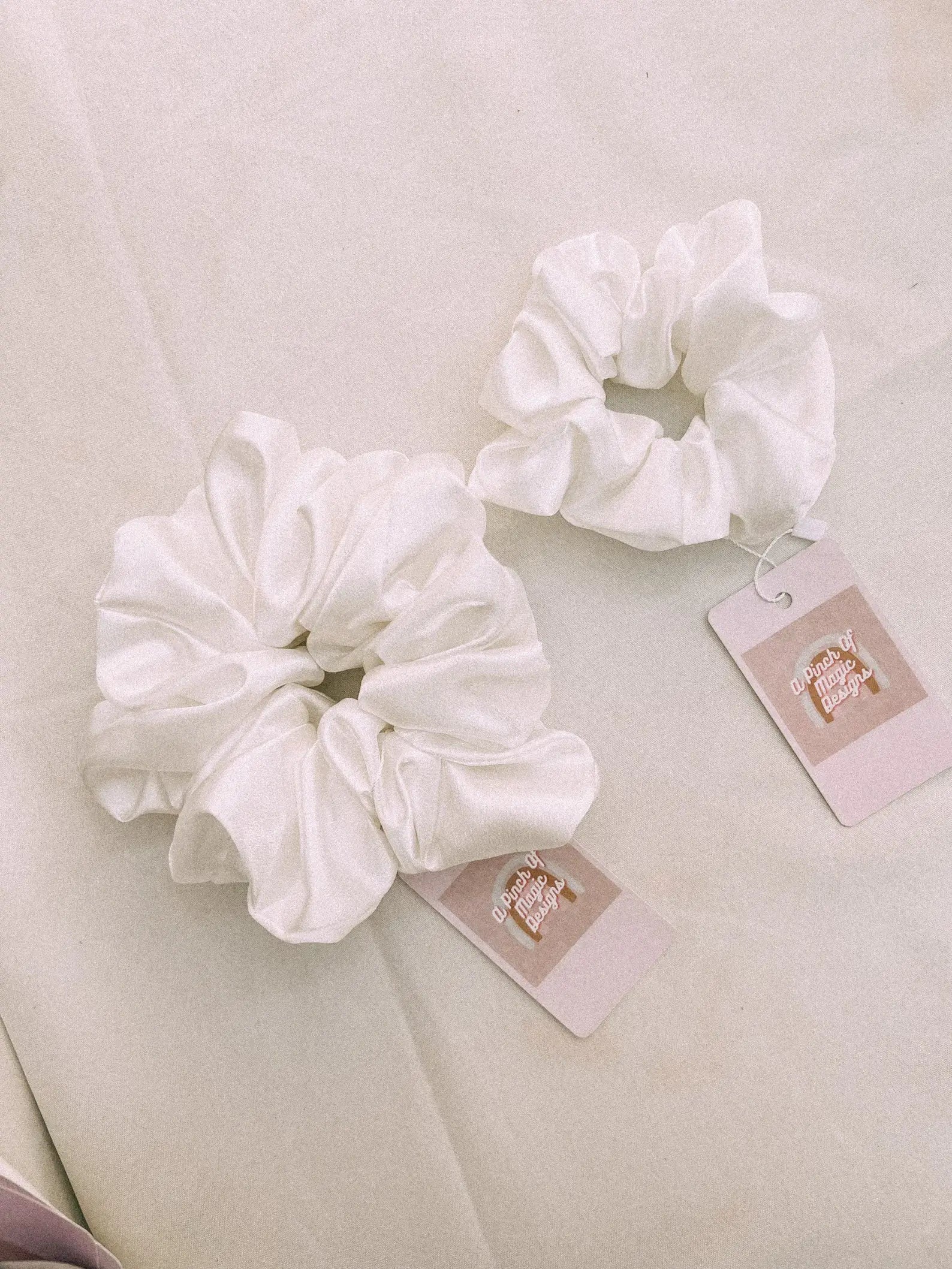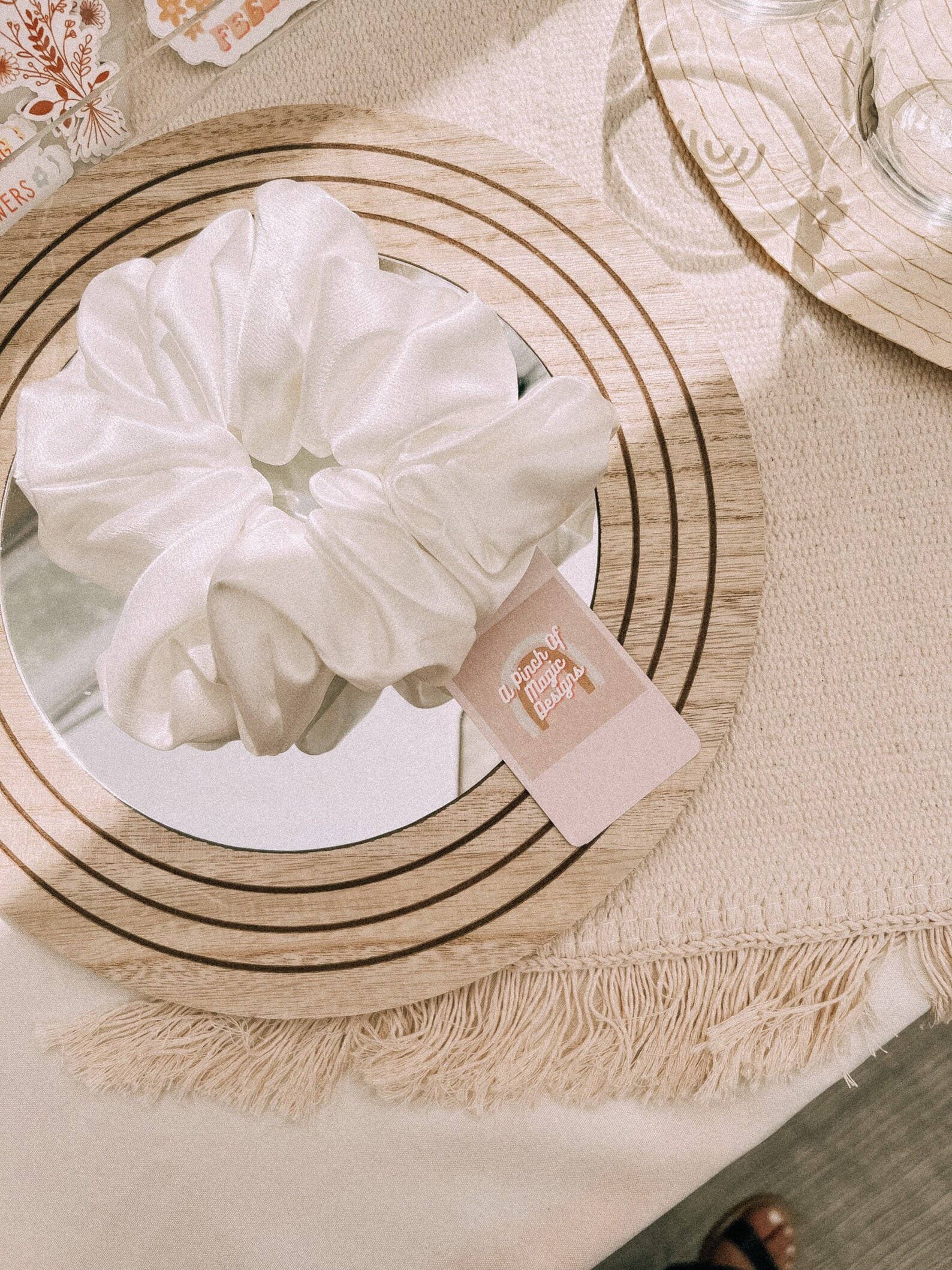 Satin hair scrunchie made with high quality satin fabric and elastic to ensure flexibility and stretch. Perfect for top knots, messy buns, workouts or on the wrist as an accessory. Reusable/Washable