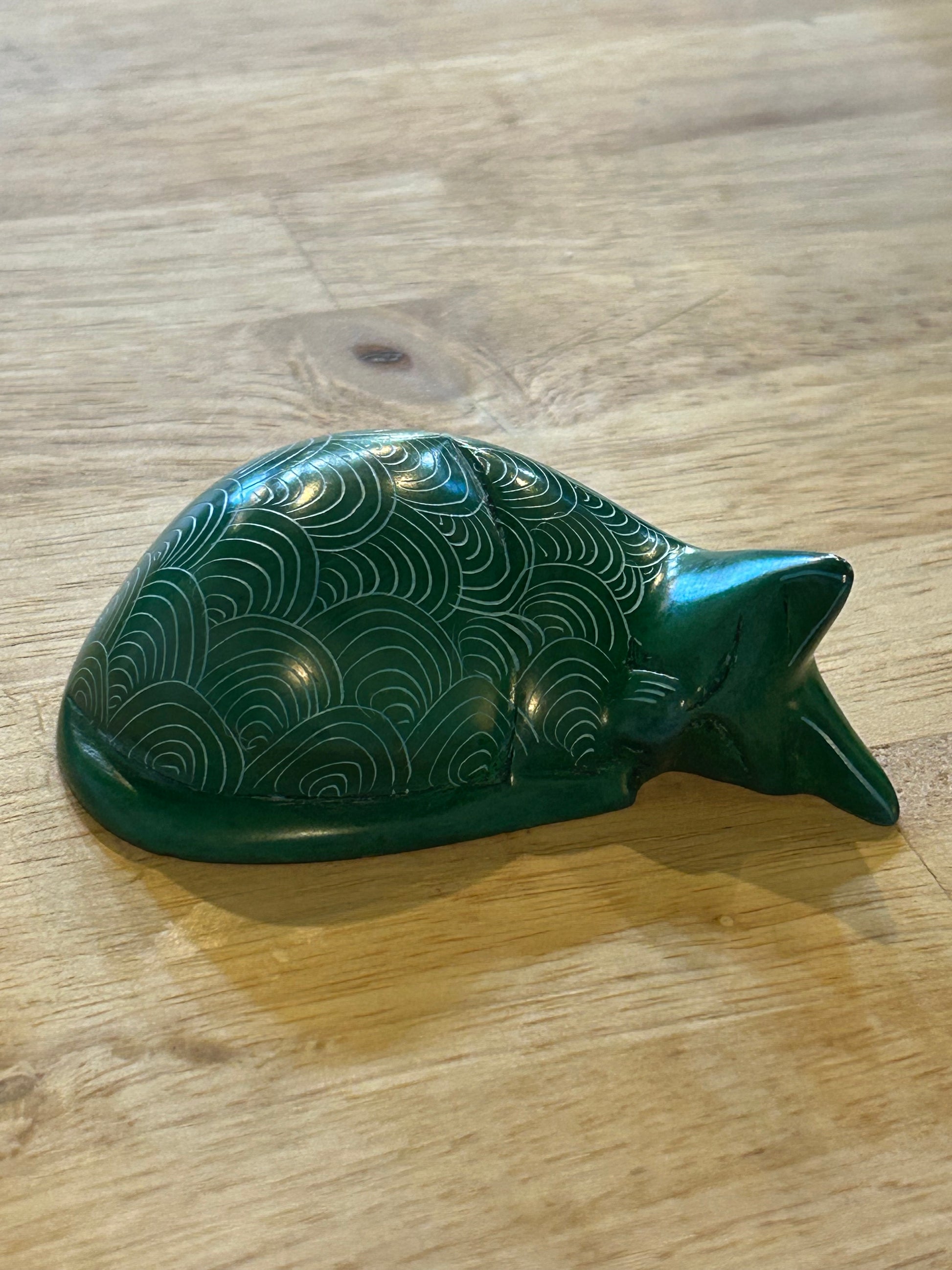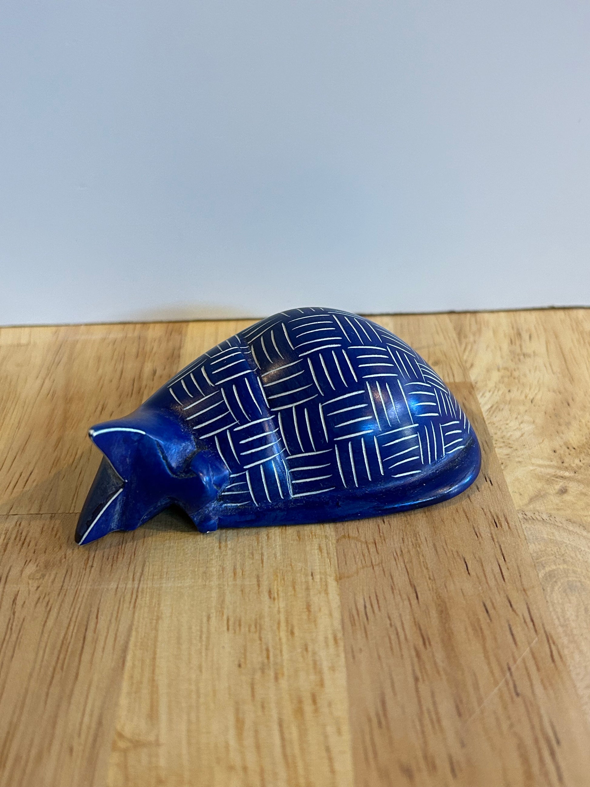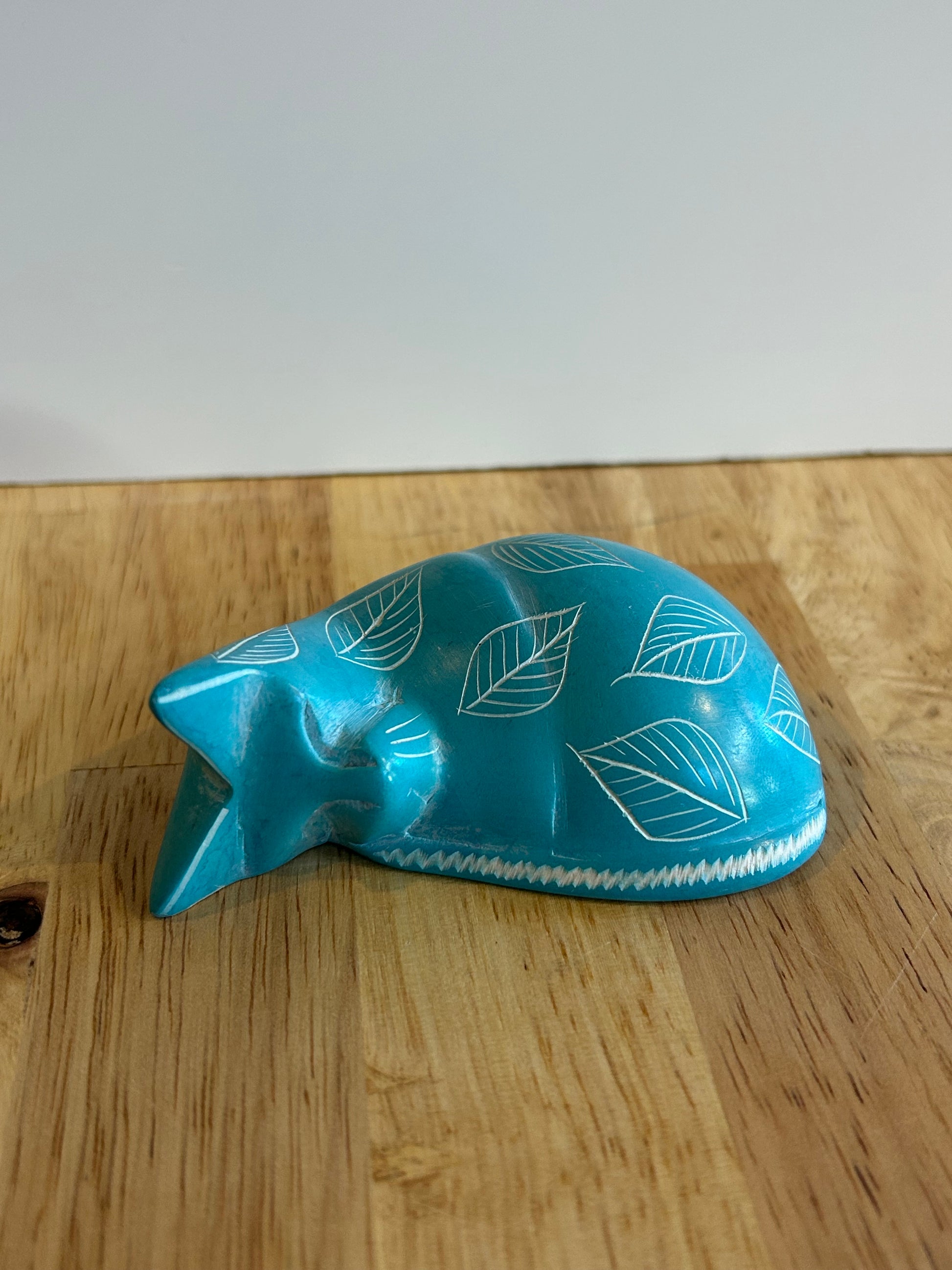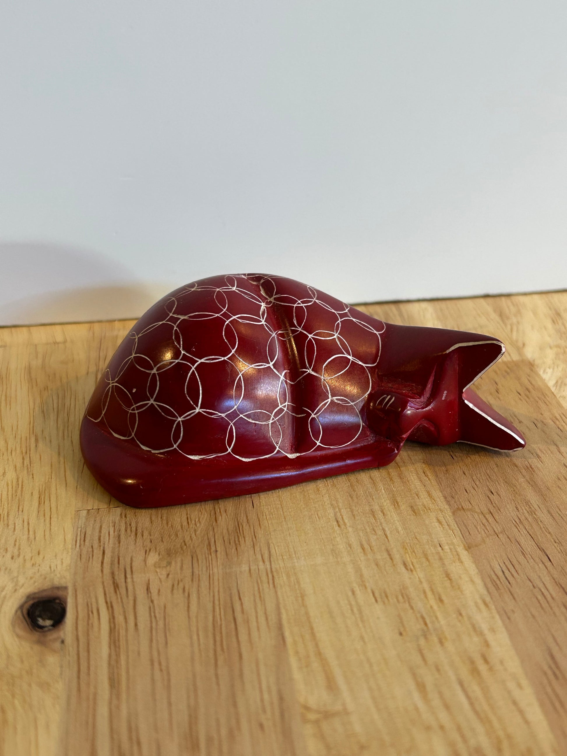 These beautiful sleeping cats are a fair trade product handmade in Kenya. They are hand carved out of stone, sanded until smooth, and dyed. Then an artisan uses a knife to etch the patterns into each cat.