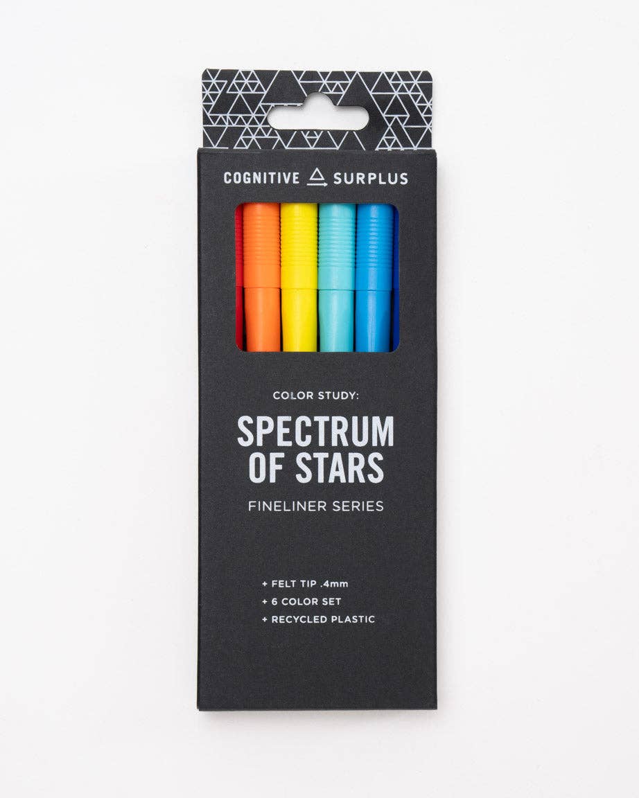 Stars shine in different colors depending on how hot the surface is. The hottest stars burn blue and the coolest burn red, with all the temperatures in between shining along the spectrum, in shades of orange, yellow, and green. These finalizer pens are perfect for inspiring astral musings.