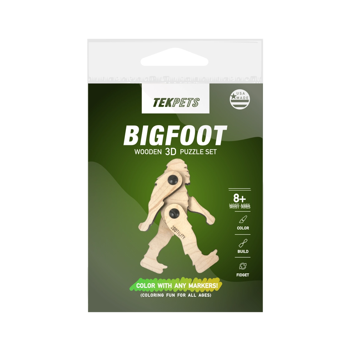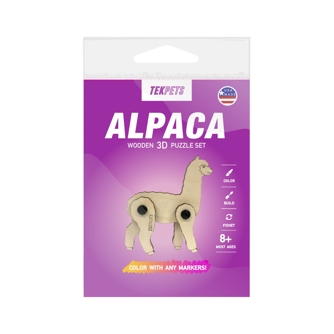 TekPets are a collection of build-your-own Wooden Toy sets. Each model is assembled with plastic screws and results in a playful toy or fidget device that has many degrees of motion. Optionally, color them in with any markers before assembling. Fun for ages 8+, this educational STEM toy promotes spatial reasoning and is a fun activity for parents to do with kids. Made in the USA of laser cut birch wood.