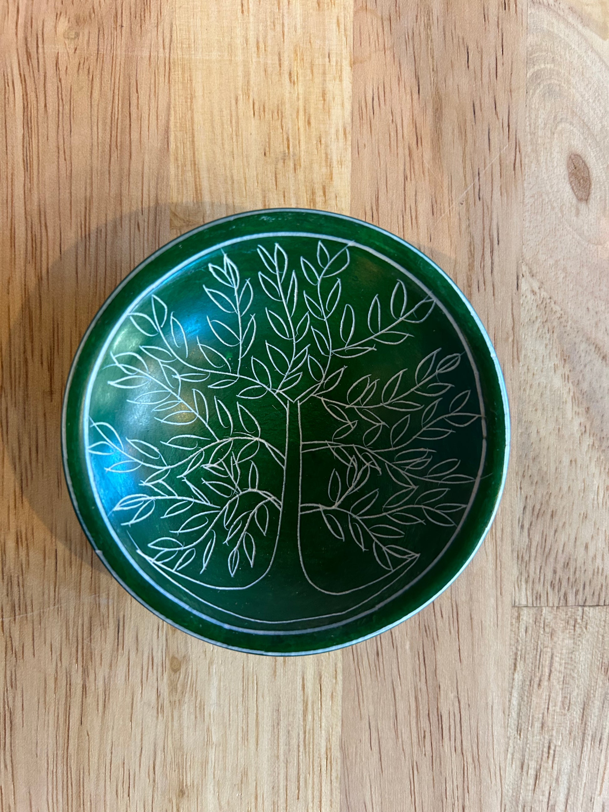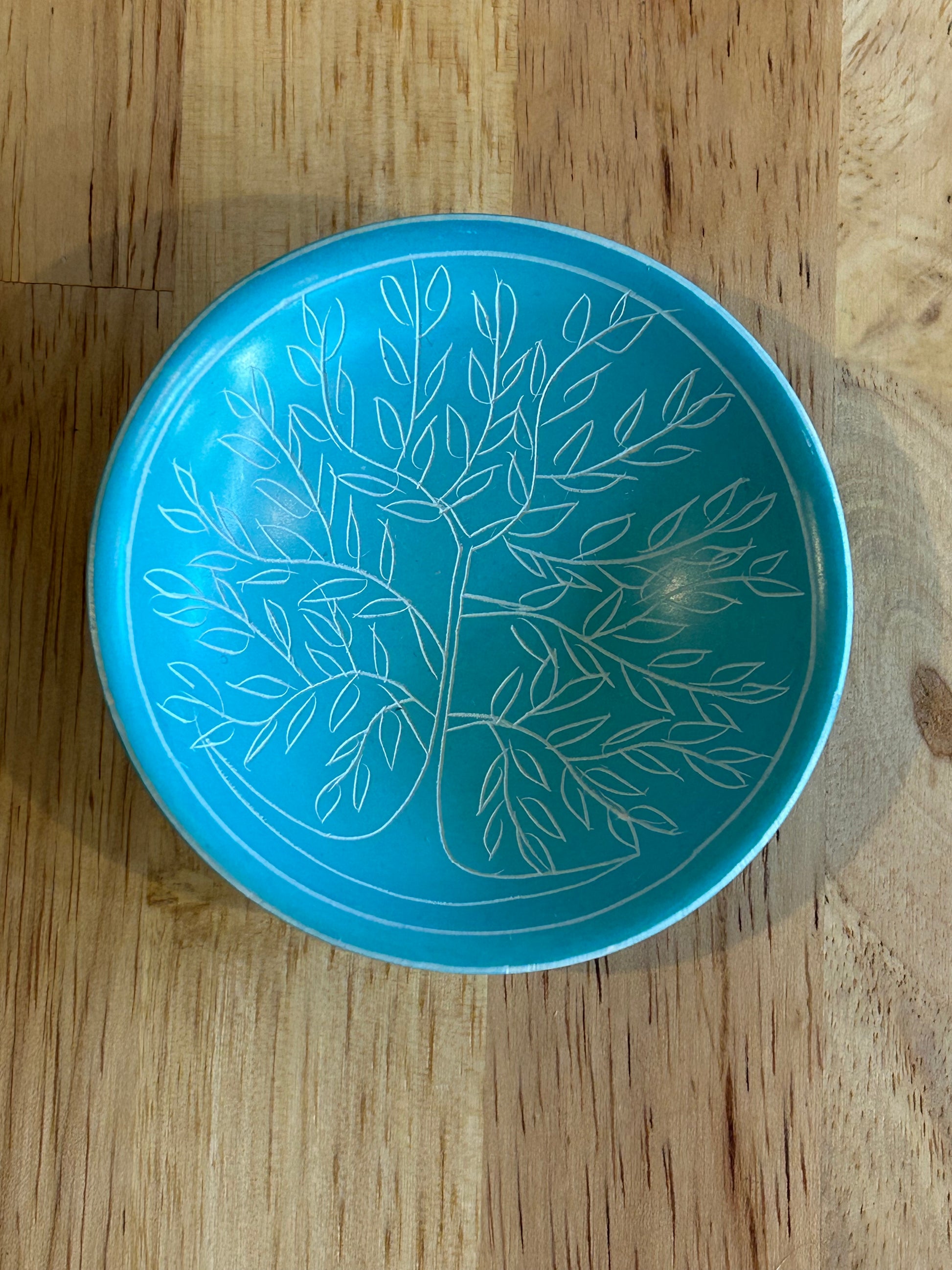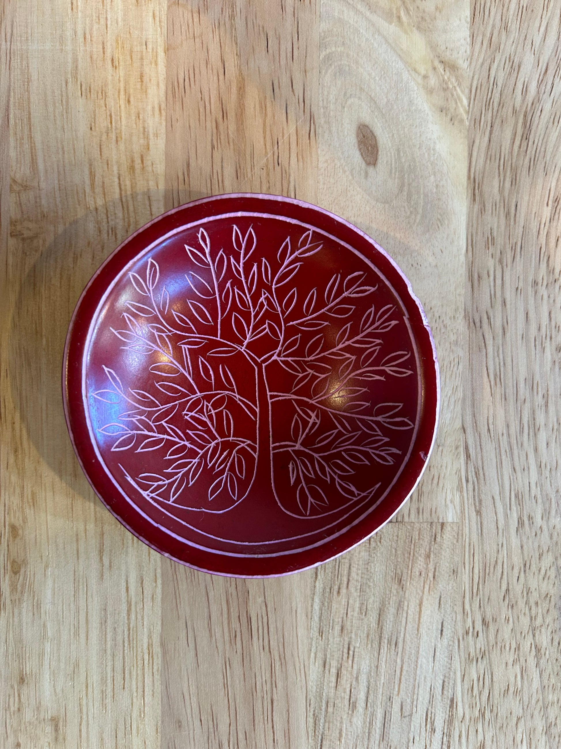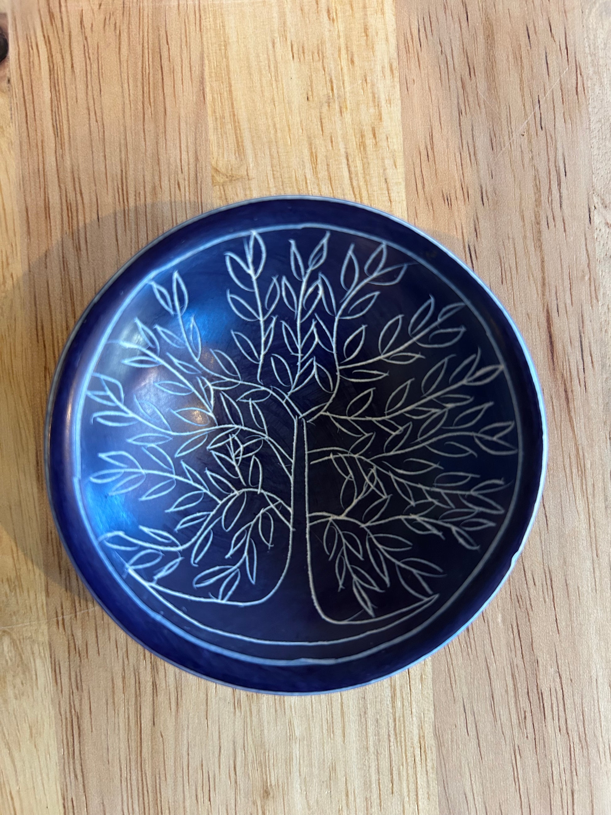 These colorful round tree of life dishes are a fair trade product handmade in Kenya. They are hand-carved out of stone, sanded until smooth, and dyed. Then an artisan uses a knife to etch a tree of life into each dish. These unique catchalls can be used to hold change, jewelry, keys, or office supplies. For decorative use only; getting them wet could damage the dye. Approximately 3 inches wide.