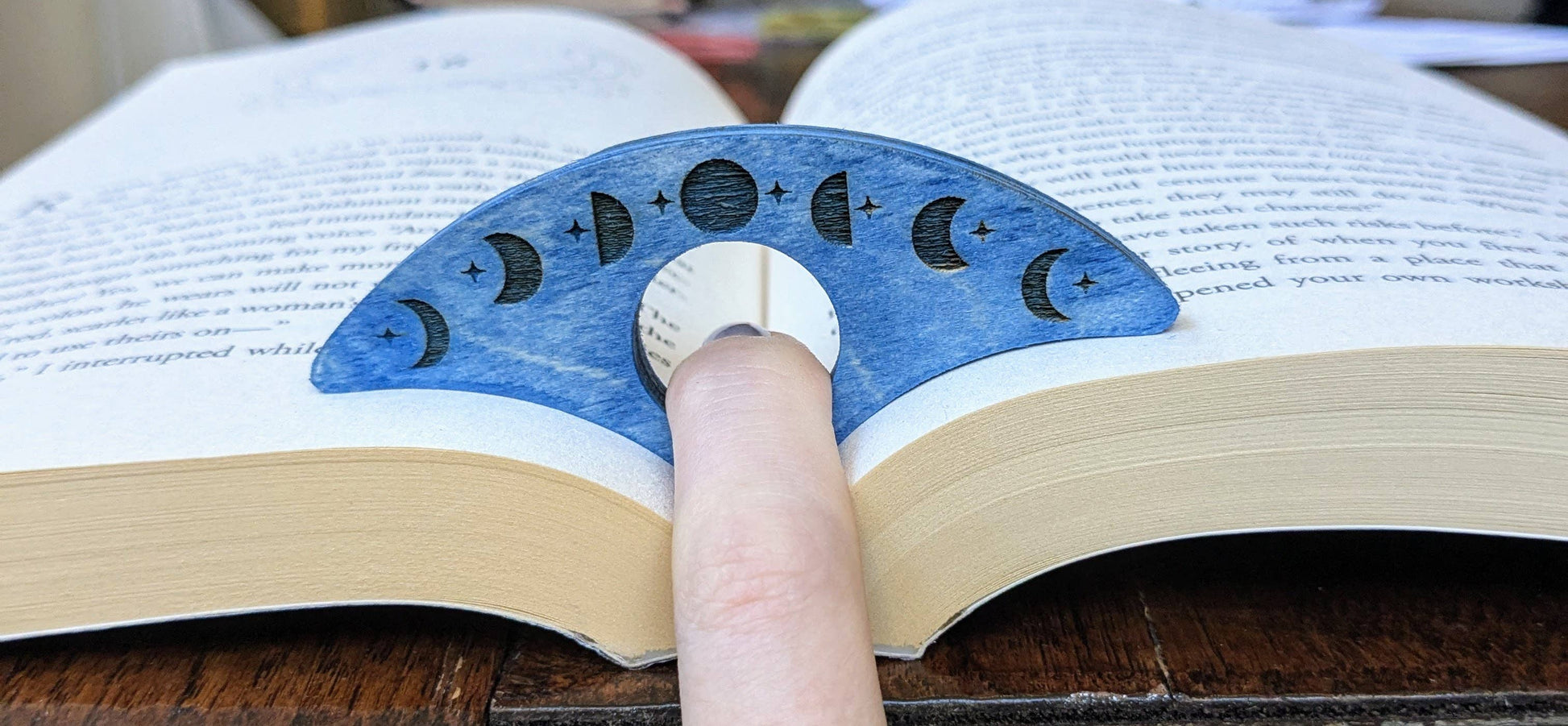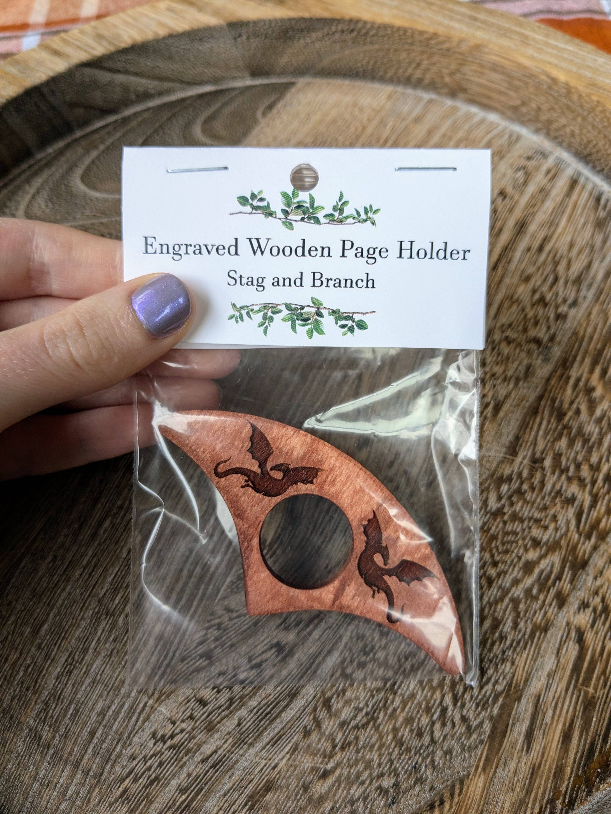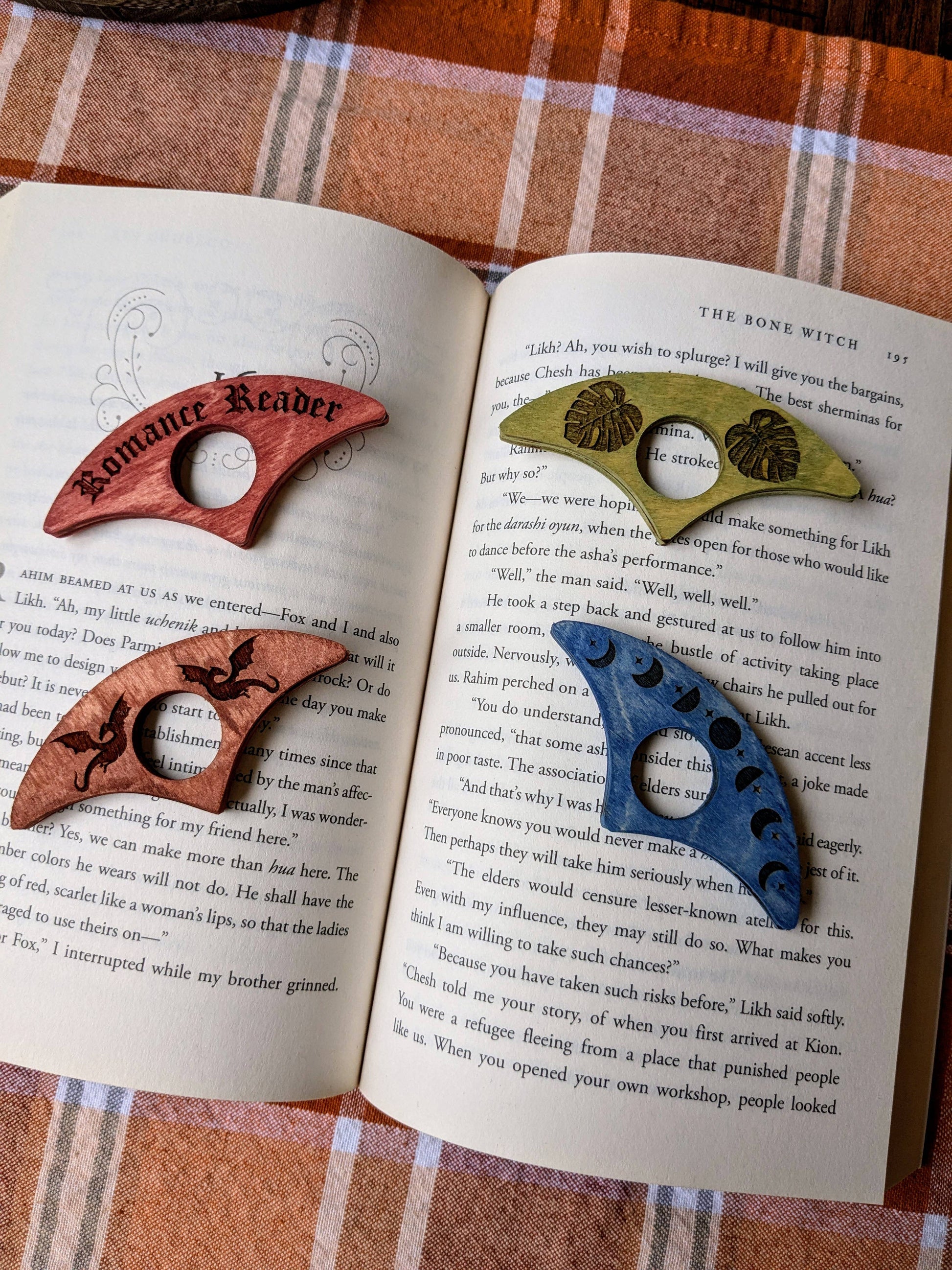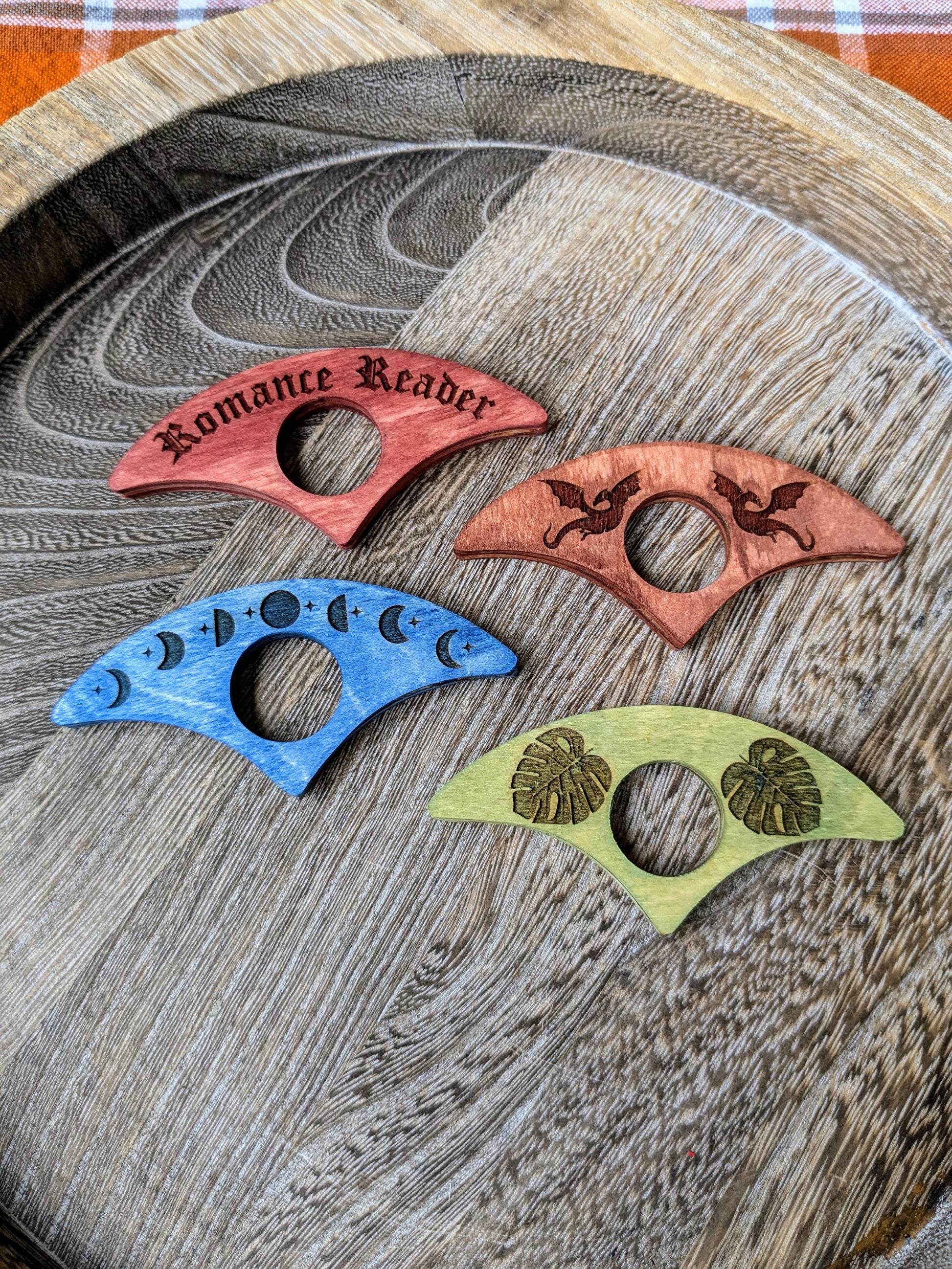 Hold books one-handed comfortably with these wooden page holders available in four designs. These are two layers of 1/8th inch birch wood (engraved details on both sides!) that allow a sturdy comfortable hold both in your hand and on your book. Handmade in the Pacific Northwest. Made with: two layers of ⅛ inch birch wood, wood stain