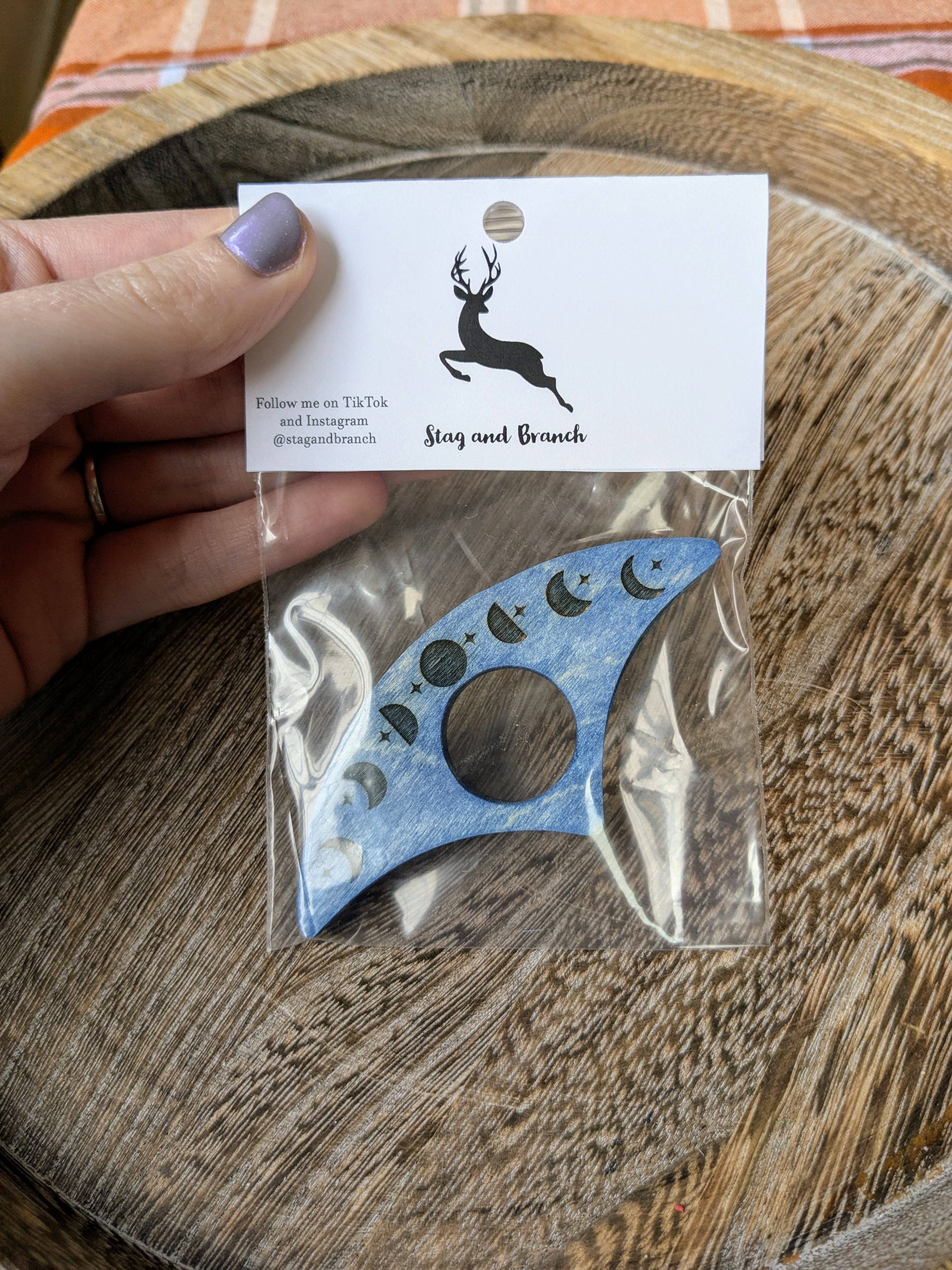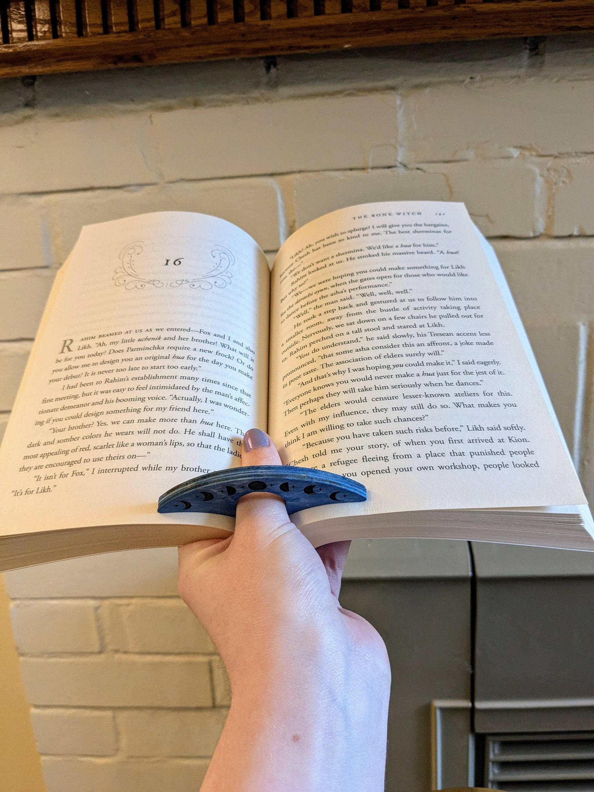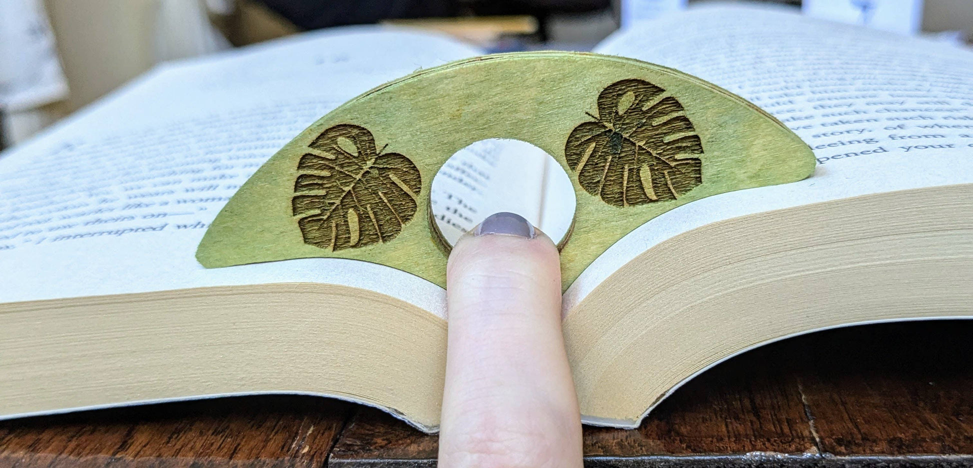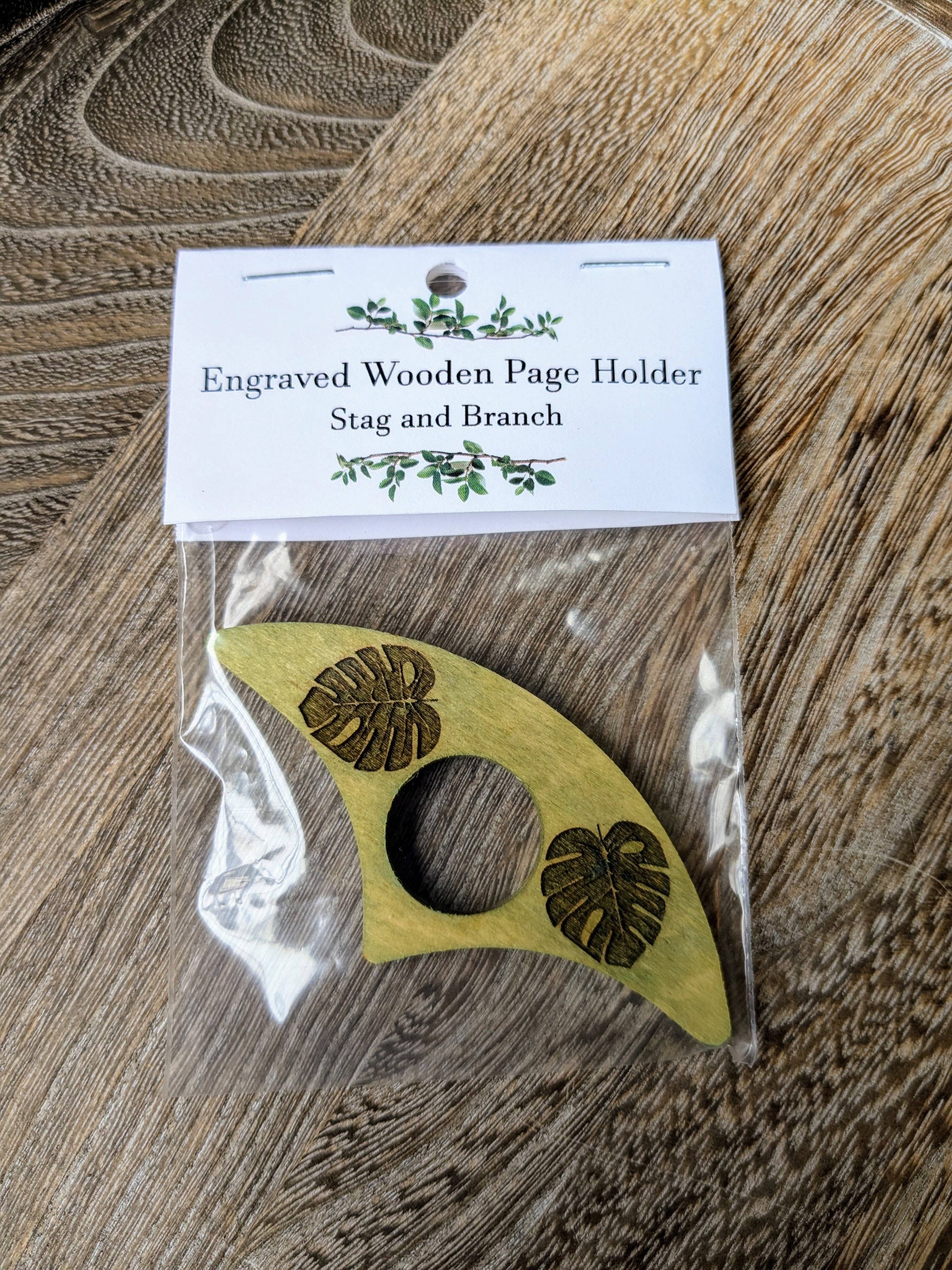 Hold books one-handed comfortably with these wooden page holders available in four designs. These are two layers of 1/8th inch birch wood (engraved details on both sides!) that allow a sturdy comfortable hold both in your hand and on your book. Handmade in the Pacific Northwest. Made with: two layers of ⅛ inch birch wood, wood stain